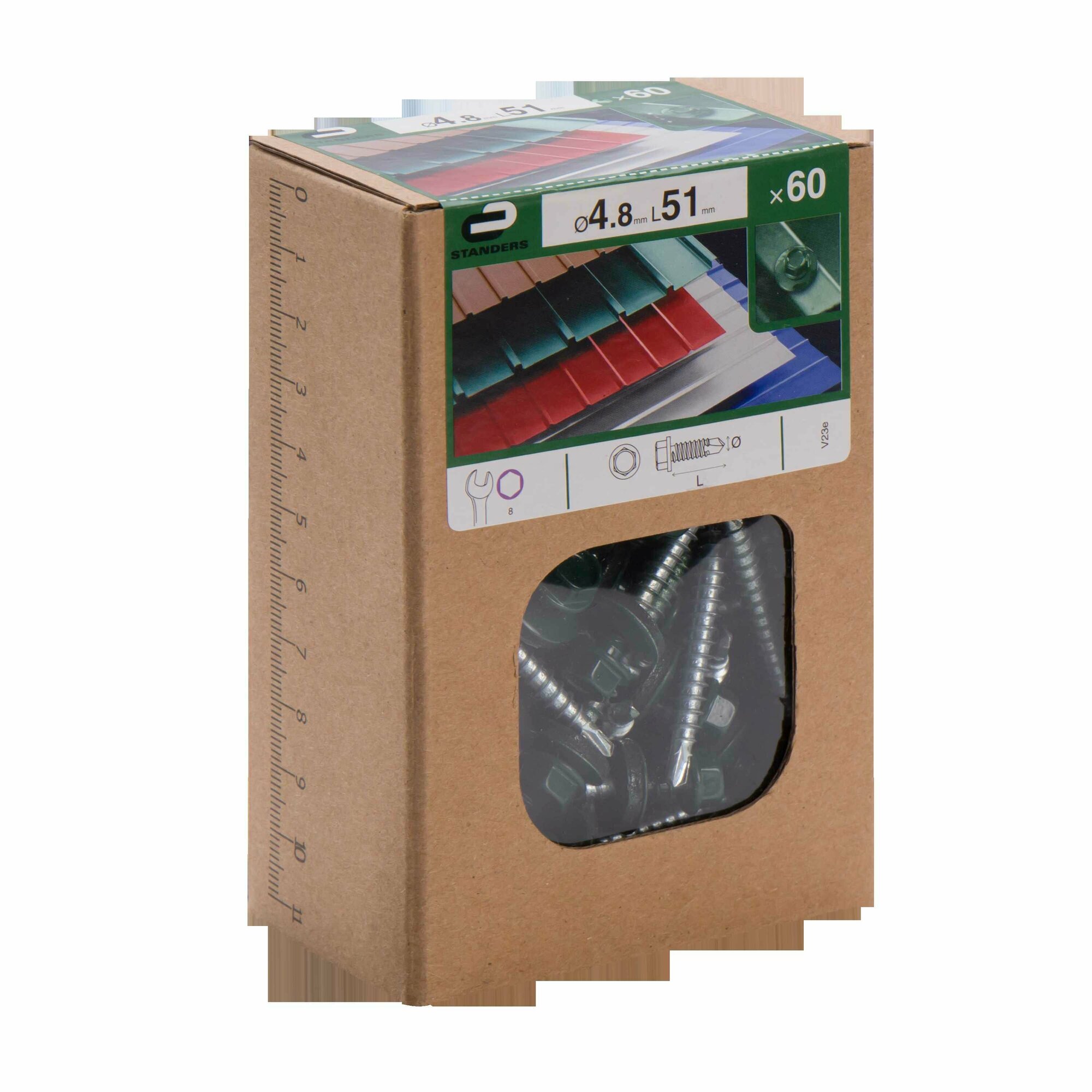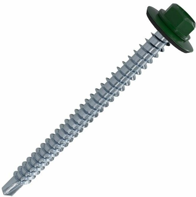 Саморез кровельный Standers диаметром 4,8 и длиной 51 мм предназначен для крепления кровельного железа, металлочерепицы, профилированных щитов, а также фасонных деталей из плоских листов металла. Шестигранная головка предназначена для использования со специальной торцевой битой-насадкой размером 8 мм. Саморез изготовлен из стойкой к коррозии оцинкованной стали, головка окрашена в зелёный цвет. Эластичная прокладка обеспечивает герметичное примыкание головки к листу.