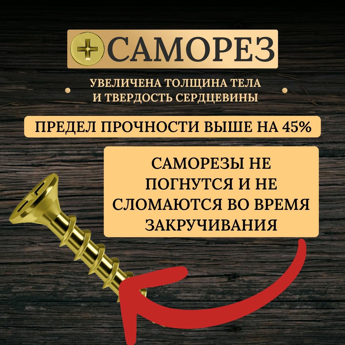 Увеличенная толщина тела и усиленная сердцевина самореза повышают максимальный предел прочности на скручивание в среднем до 10.8 Нм (выше на 45%*). Саморезы гарантированно не погнутся и не сломаются во время закручивания!