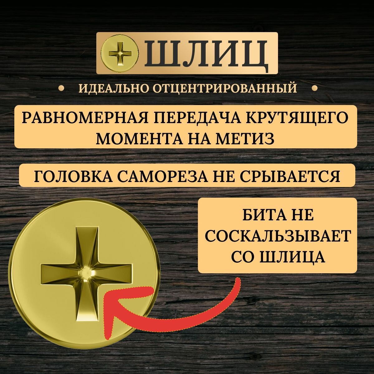 Строгий фабричный контроль центровки шлица каждого самореза позволяет максимально снизить возможные случаи брака. Это обеспечивает равномерную передачу крутящего момента на метиз – головка самореза не срывается и бита не соскальзывает со шлица.