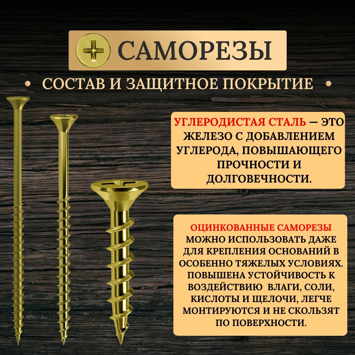 Саморез изготовлен из оцинкованной стали, устойчивой к высокой влажности. Длина изделия составляет 51 мм, диаметр — 3,5 мм. Количество в наборе — 100 шт.