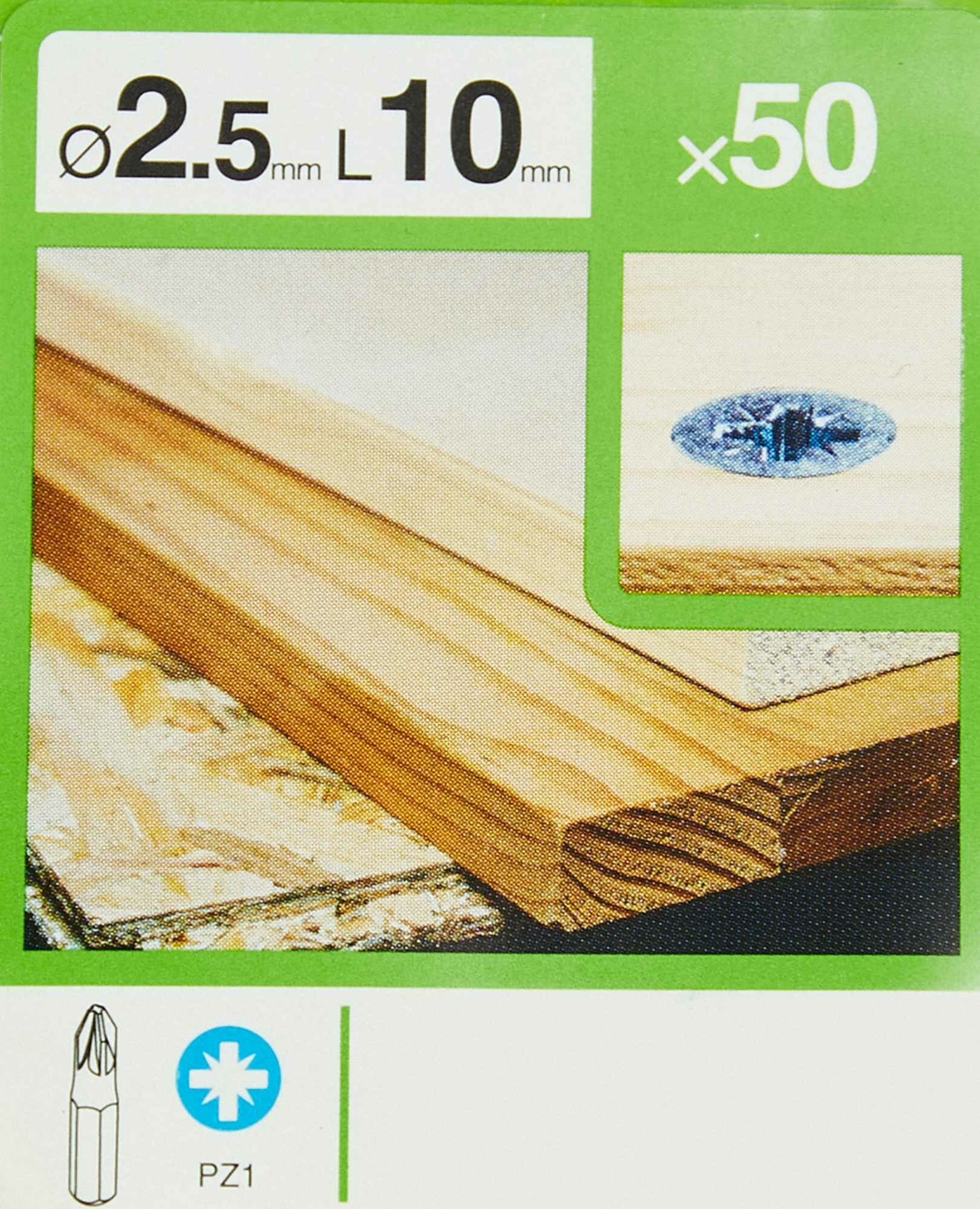 Изделие выполнено из стали с цинковым покрытием, защищающим от коррозии. Предназначено для использования внутри помещений. Длина самореза составляет 10 мм, диаметр — 2,5 мм. Количество в наборе — 50 шт.
