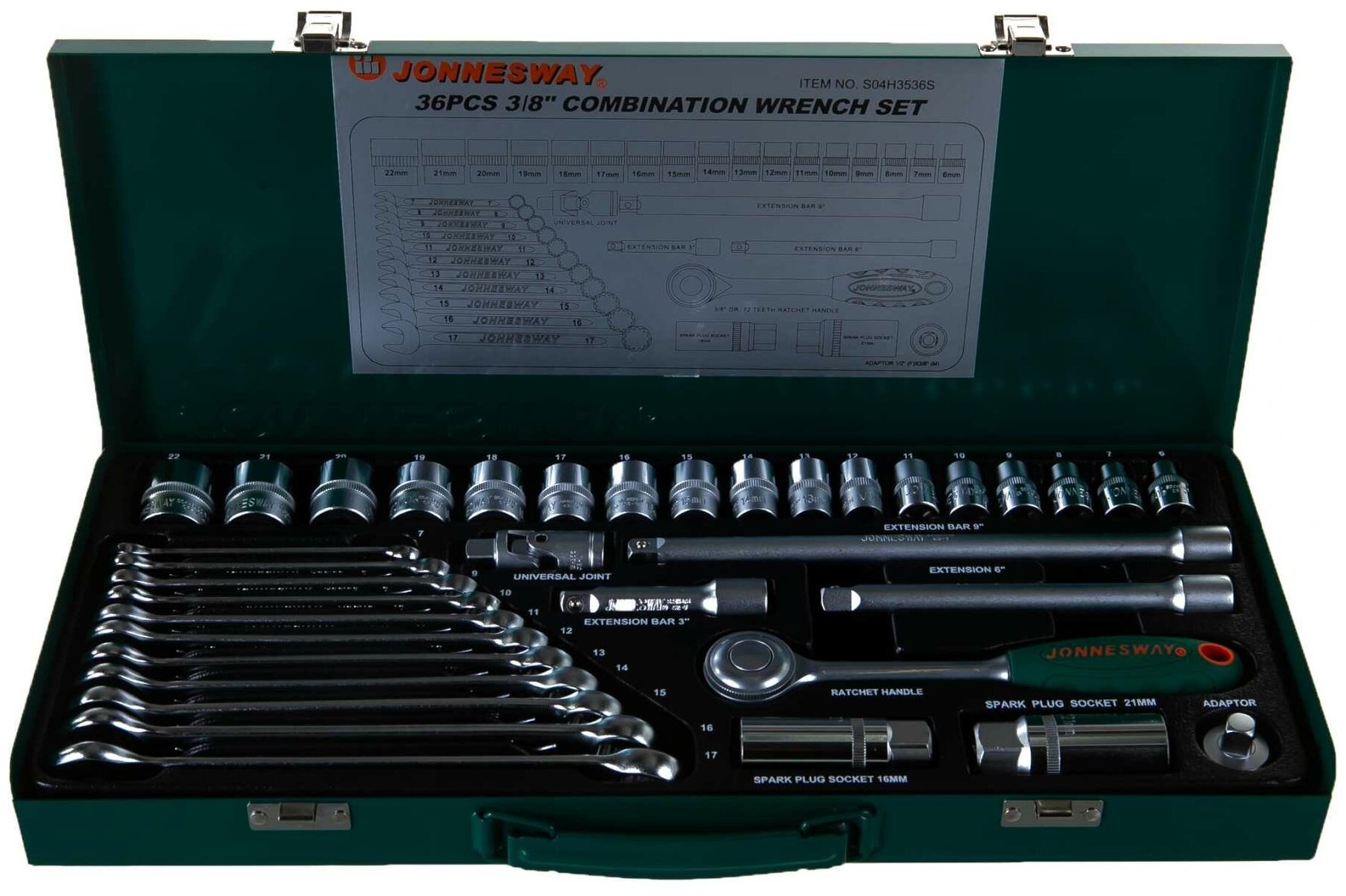 Набор торцевых головок и комбинированных ключей Jonnesway состоит из 36 предметов. Используется для монтажных, демонтажных, слесарных работ при производстве, ремонте автомобилей и другой техники. В комплект входят торцевые головки с размером посадочного отверстия - 3/8", приводы вращения, комбинированные ключи. Все что нужно для удобной, качественной работы с крепежом различного профиля и слабонагруженными резьбовыми соединениями.