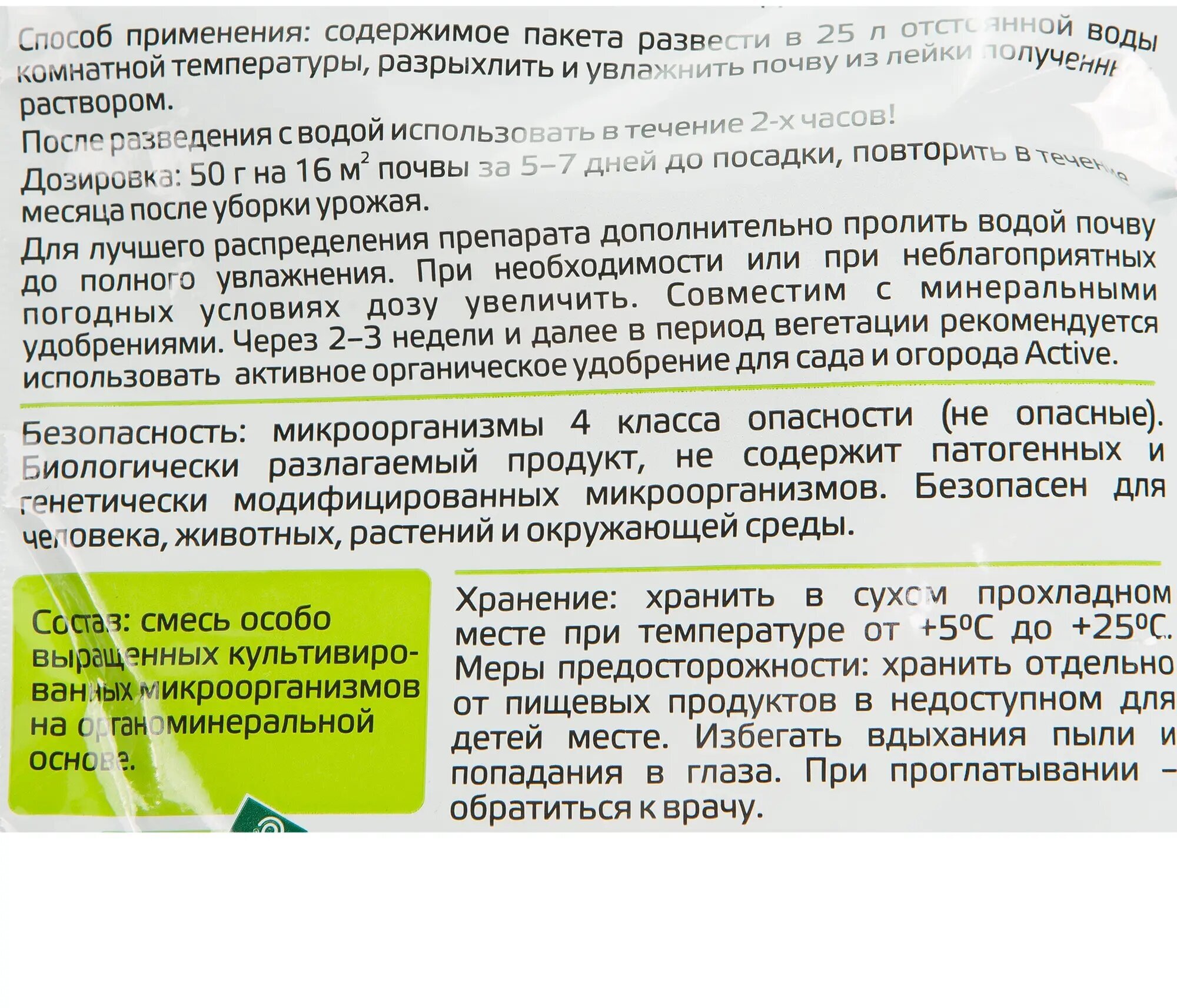 | Способ применения | Содержимое пакета развести в 25 л отстоянной воды комнатной температуры, разрыхлить и увлажнить почву из лейки полученным раствором . |