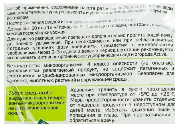 Перед применением развести содержимое пакета в 25 л воды. Во избежание потери полезных свойств полученный раствор рекомендуется использовать в течение 2 часов.