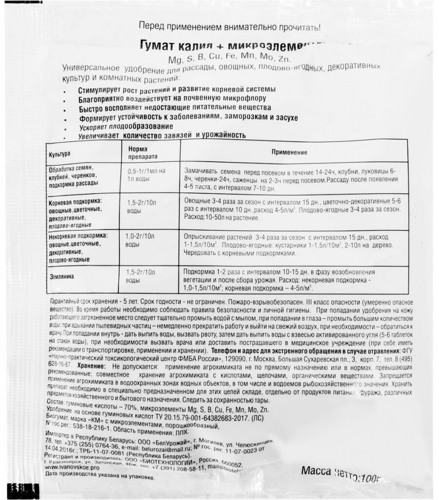 | Состав | Калиевые и/или натриевые соли гуминовых кислот, микроэлементы |