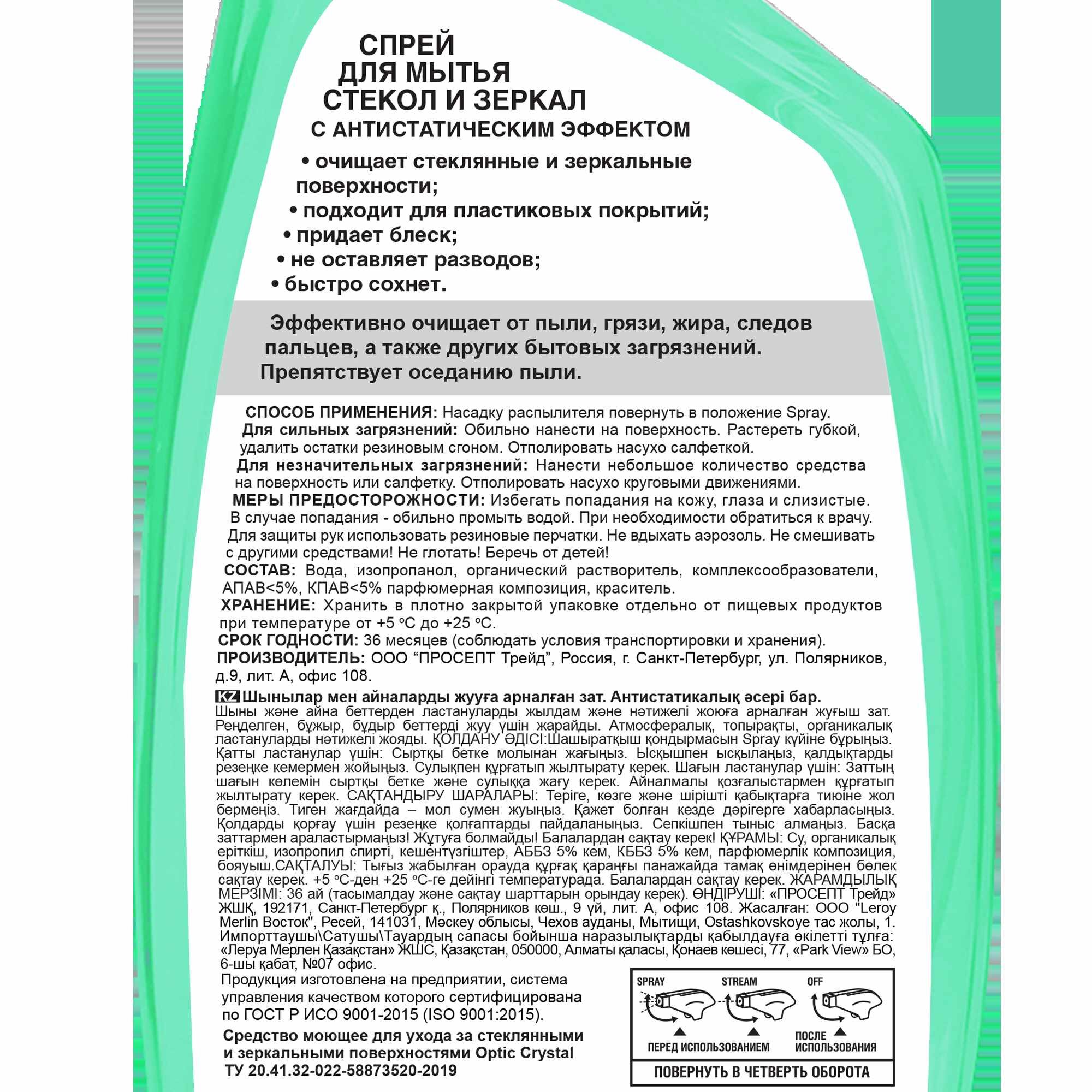 | Инструкция по применению | Насадку распылителя повернуть в положение Spray.Для сильных загрязнений: Обильно нанести на поверхность. Растереть губкой, удалить остатки резиновым сгоном. Отполировать насухо салфеткой.Для незначительных загрязнений: Нанести небольшое количество средства на поверхность или салфетку. Отполировать насухо круговыми движениями. |