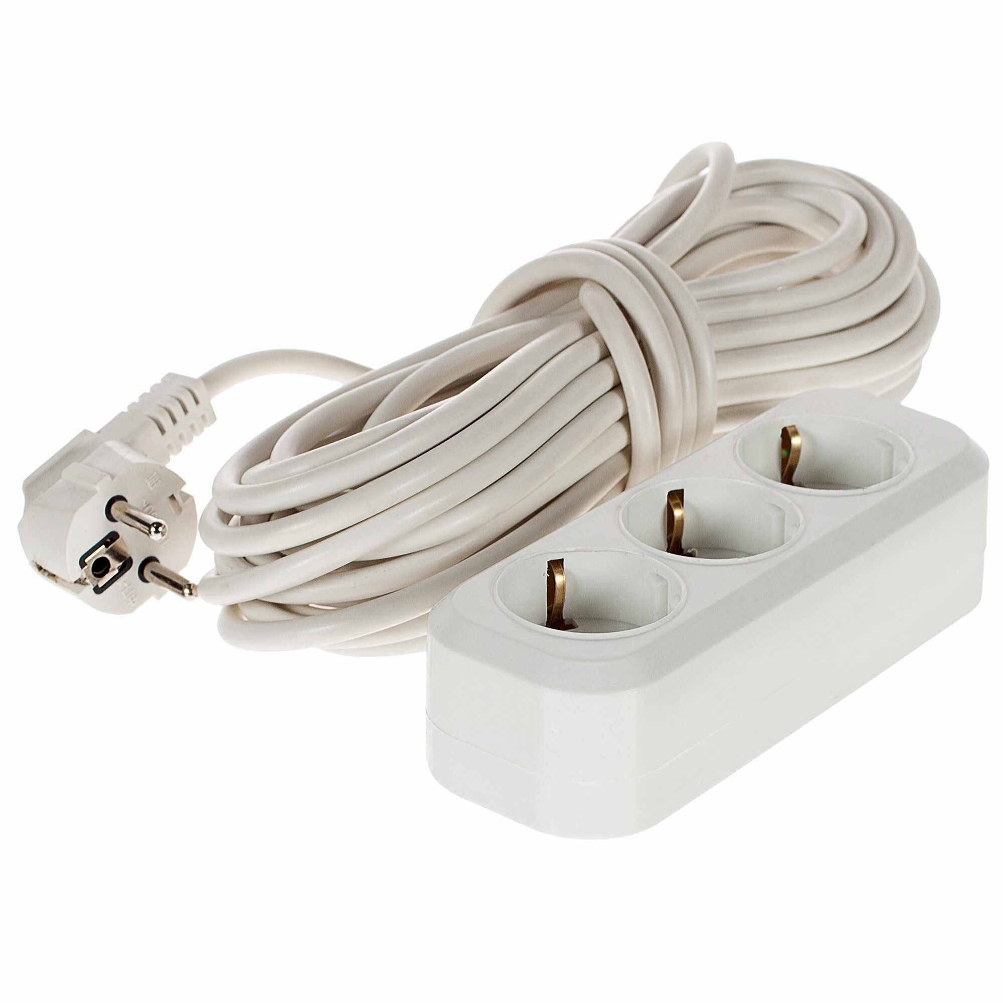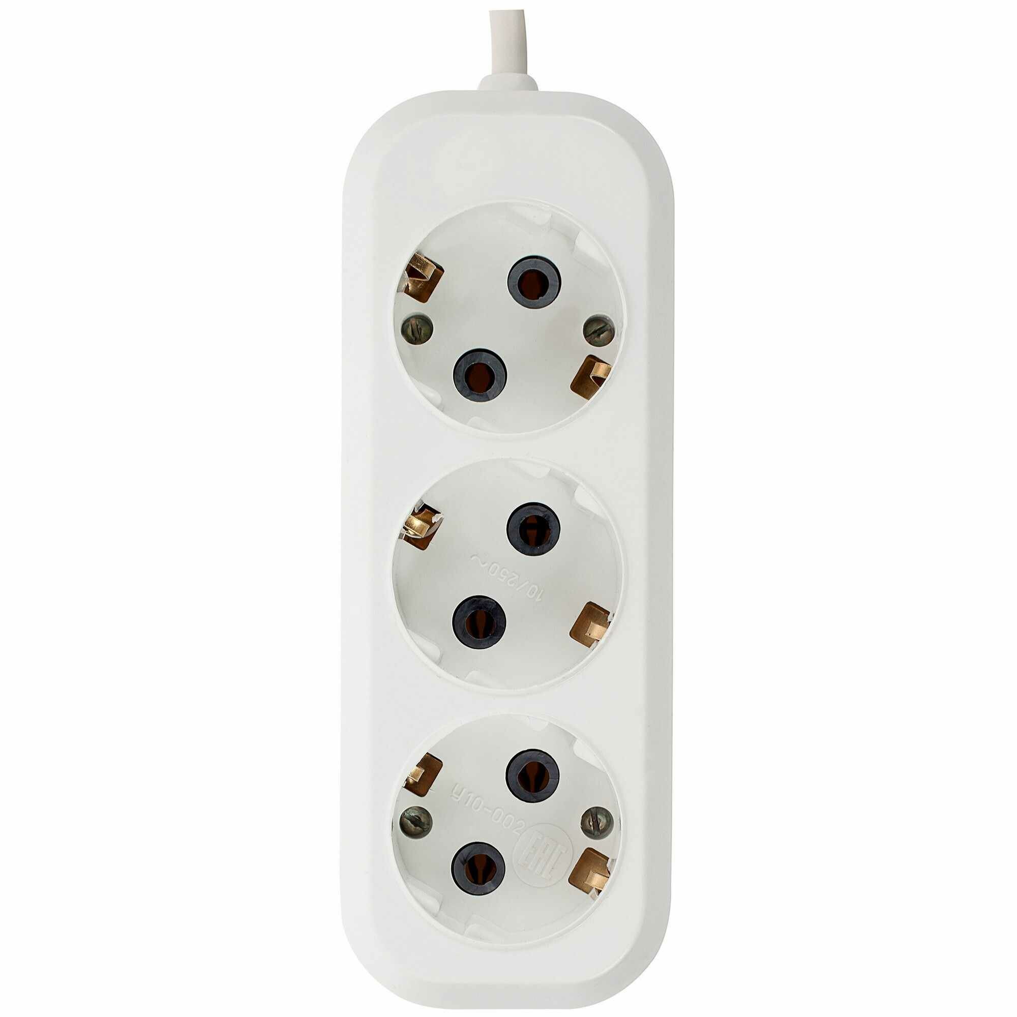 Модель на 3 розетки изготовлена из пластика. Предназначена для внутреннего использования, имеет степень защиты IP20 (подходит для работы в сухих закрытых помещениях). Максимальная мощность подключаемых приборов — 3500 Вт. Удлинитель оснащен проводом длиной 10 м.