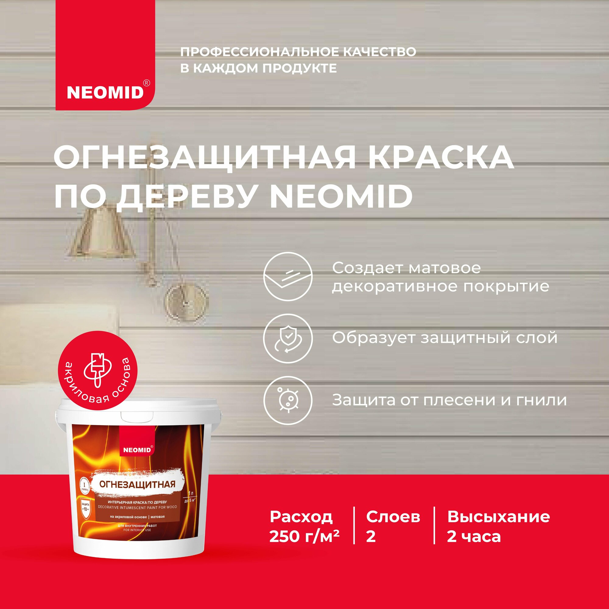 Краска интерьерная по дереву Neomid акриловая, на водной основе. Может применяться для окрашивания потолков, стен, деревянных конструкций, поверхностей из древесно-стружечной и древесно-волокнистой плиты, фанеры. Обладает огнезащитными свойствами, предотвращает появление гнили и плесени. Не имеет запаха. Цвет — белый матовый. Поставляется в пластиковых ведрах, объем — 1 л.