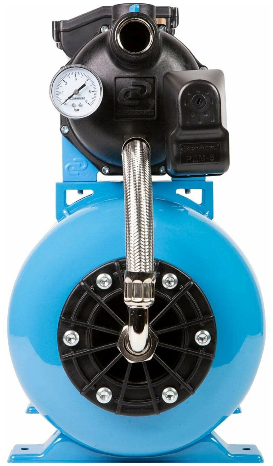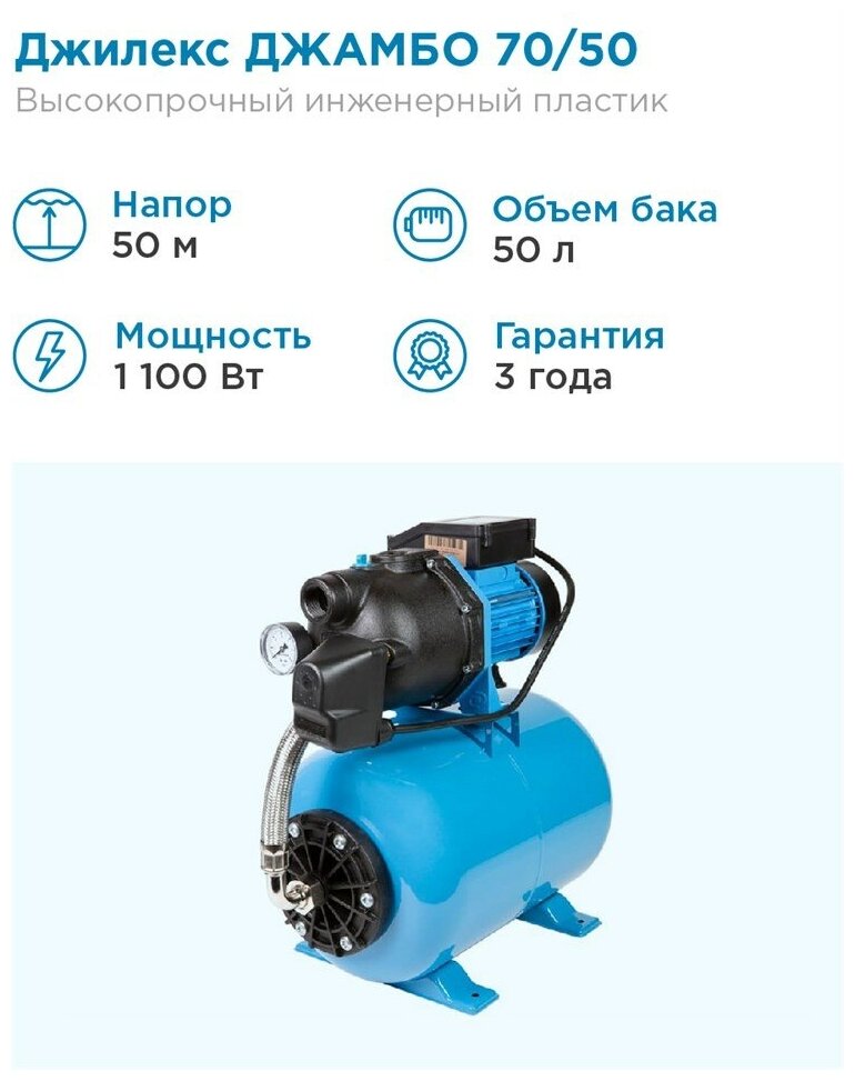 популярная марка центробежных насосов от российской компании Джилекс. Отличие данной модели насоса-автомата от других моделей линейки Джамбо заключается в наличии гидроаккумулятора объемом 50 литров, реле давления РДМ-5, и в материале корпуса у это стеклонаполненный полипропилен.