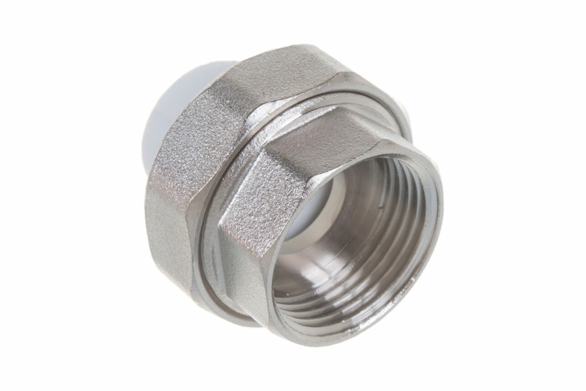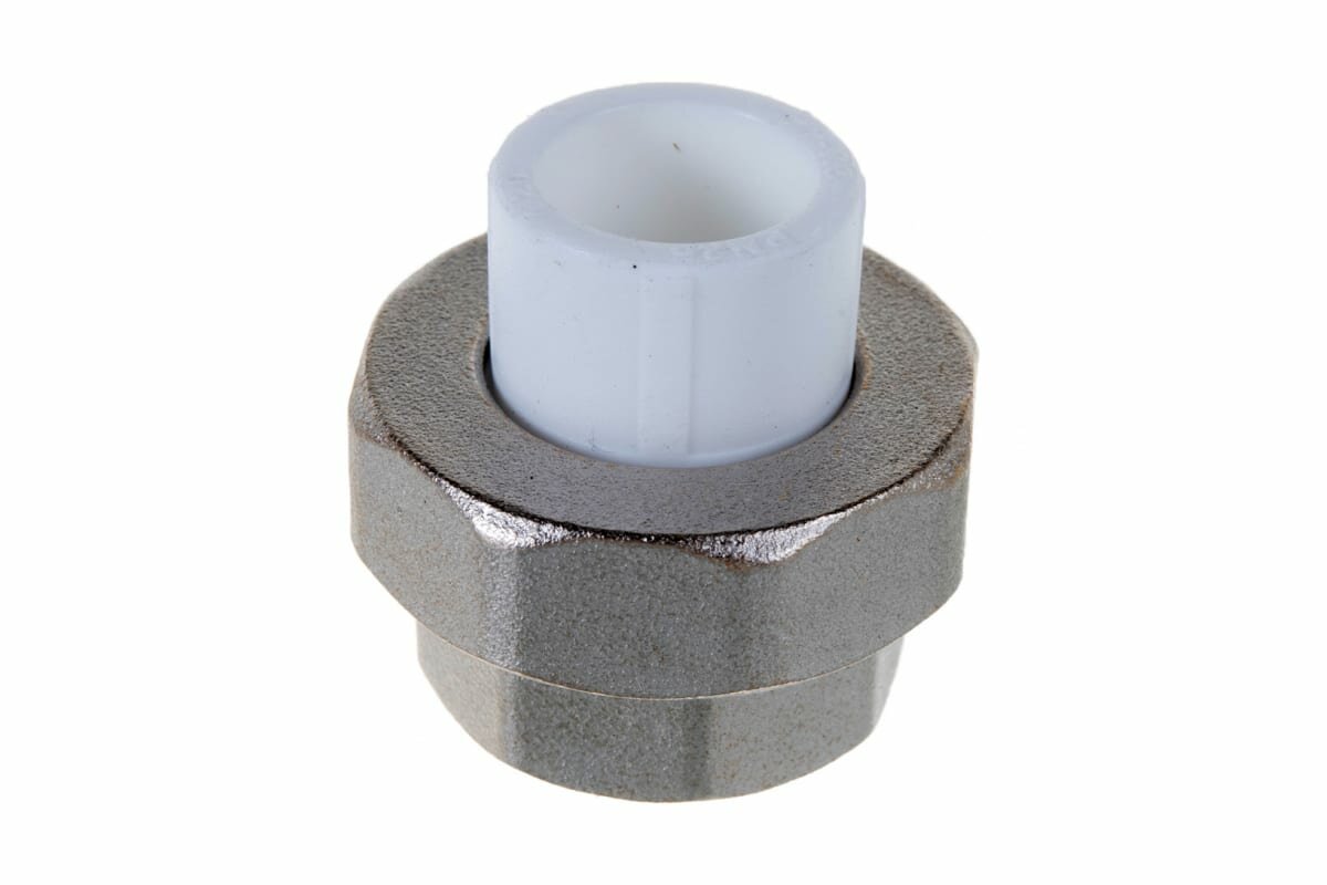 Муфта комбинированная разъёмная раструбная — фитинг для соединения труб: полипропиленовой через раструб (входной диаметр 20 мм) и металлической через резьбу (размер 1"). Комбинация соединений — внутреннее/под пайку.