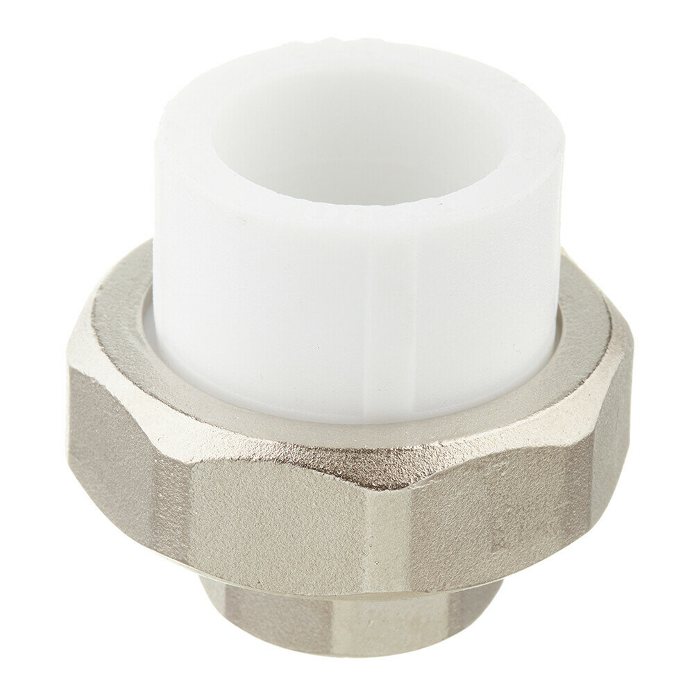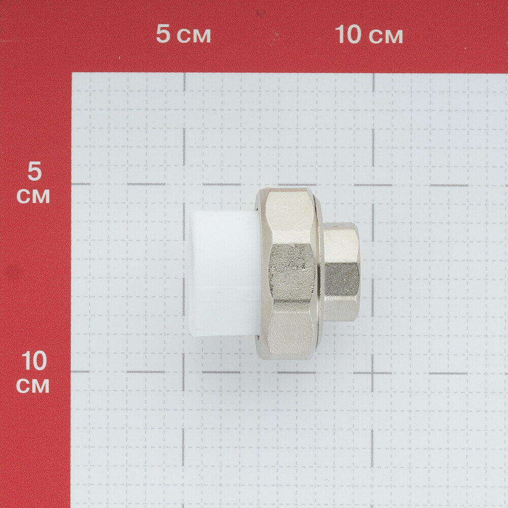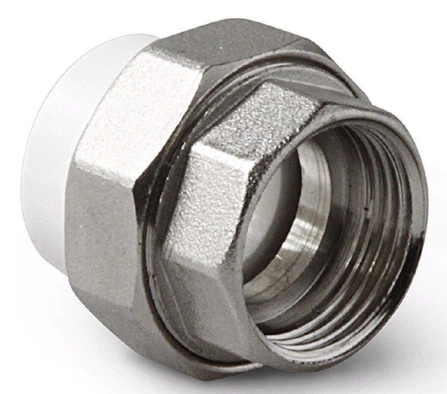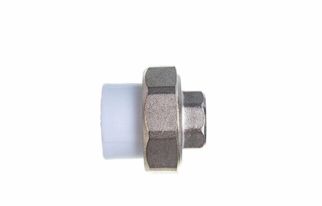 Муфта комбинированная разъёмная раструбная — фитинг для соединения труб: полипропиленовой через раструб (входной диаметр 25 мм) и металлической через резьбу (размер 1/2"). Комбинация соединений — внутреннее/под пайку.