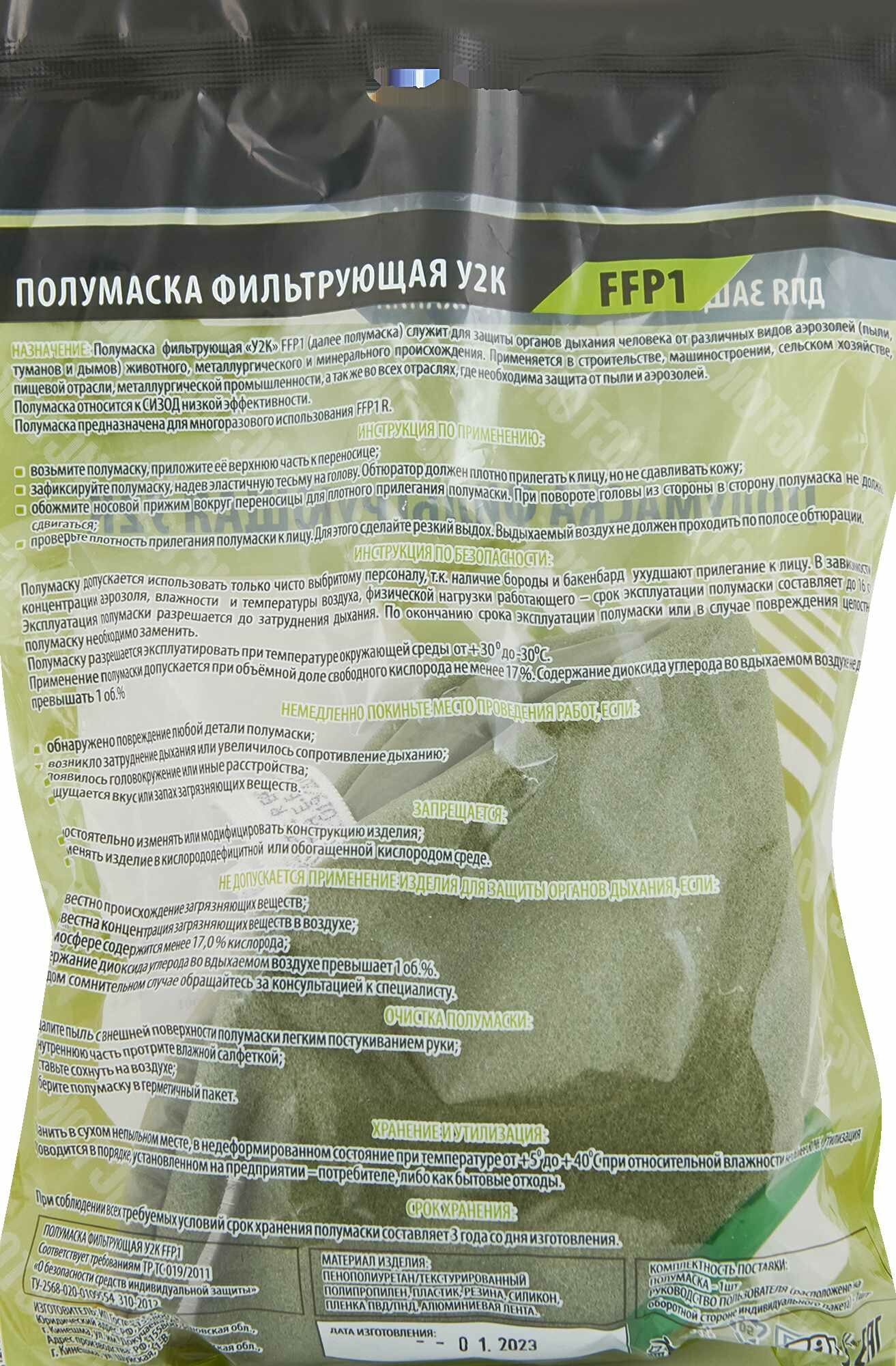 Респиратор У-2К российского производства является незаменимым средством защиты органов дыхания от различных вредных примесей, пыли, аэрозолей, мелких и твердых частиц, присутствующих в окружающей среде в ряде производственных помещений. Данное изделие выполнено из фильтрующего материала и пластика в виде полумаски, закрывающей нижнюю часть лица (рот и нос). Оснащенное клапанами для вдоха и выдоха, это одноразовое средство защиты абсолютно безопасно для здоровья, имеет небольшой вес и низкое сопротивление дыханию.