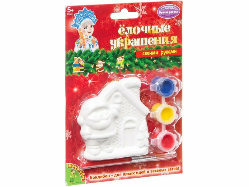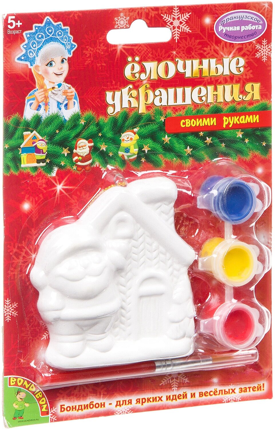 BONDIBON Набор для творчества Ёлочные украшения. Домик Деда Мороза - оригинальный способ для малыша почувствовать себя в роли декоратора игрушек для лесной красавицы. Ожидание чудесного праздника пролетит незаметно в приятных хлопотах: в коробочке будущего владельца ждет керамическая фигурка, кисточка и краски. Дом главного волшебника сможет заиграть яркими красками благодаря фантазии ребенка, который сможет потом украсить праздничную елочку своей игрушкой.
