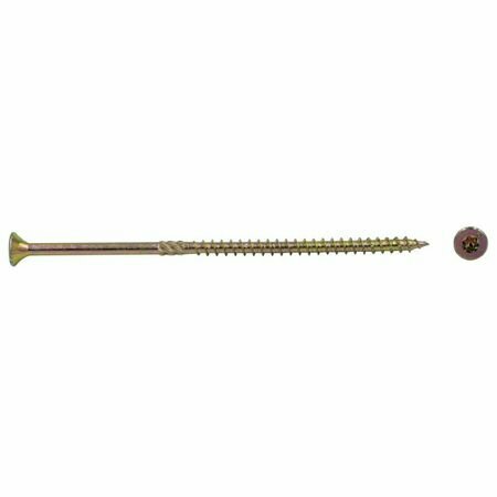 Шуруп сделан из стали и окрашен в желтый цвет. Оцинкованное покрытие защищает от коррозии. Имеет потайную головку под насадку Torx. Длина крепежа — 100 мм, диаметр — 6 мм.