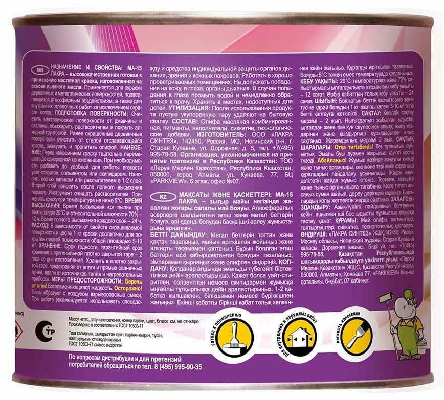 Масляная краска МА-15 от «ЛАКРА» — высокотехнологичное покрытие на основе вытяжки из льняного семени. Состав предназначен для защиты металлических и деревянных поверхностей от разрушительного влияния атмосферных явлений. Производитель допускает его использование в интерьерной отделке. Формула краски не содержит токсичных компонентов. После высыхания покрытие абсолютно безопасно, устойчиво к истиранию, превосходно выдерживает влажную уборку.