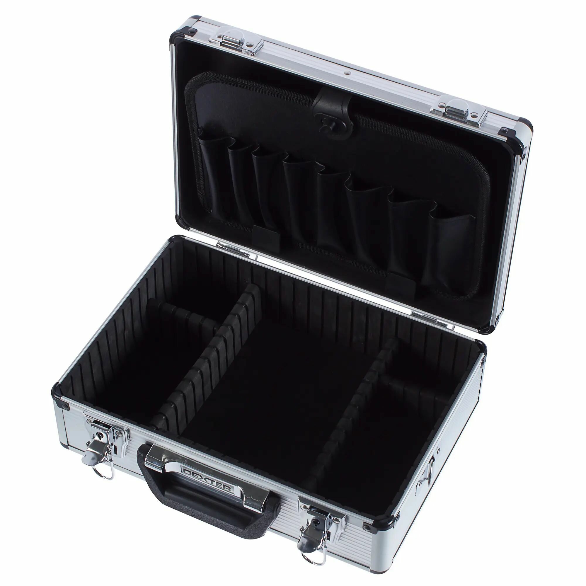 Ящик для инструмента DEXTER, алюминий – представляет собой весьма компактный, но очень вместительный кейс для хранения и транспортировки инструментов. В нем предусмотрительно размещены отделения для таких мелких деталей, как крепежи, метизы, гвозди. На крышке ящика присутствуют вкладыши и петли для удобного хранения отверток, ключей, стамесок и прочего инструмента. Главным достоинством является вместительность. Ящик выполнен из алюминия/двп. В комплекте имеется надежный ремень для переноски ящика на плече.