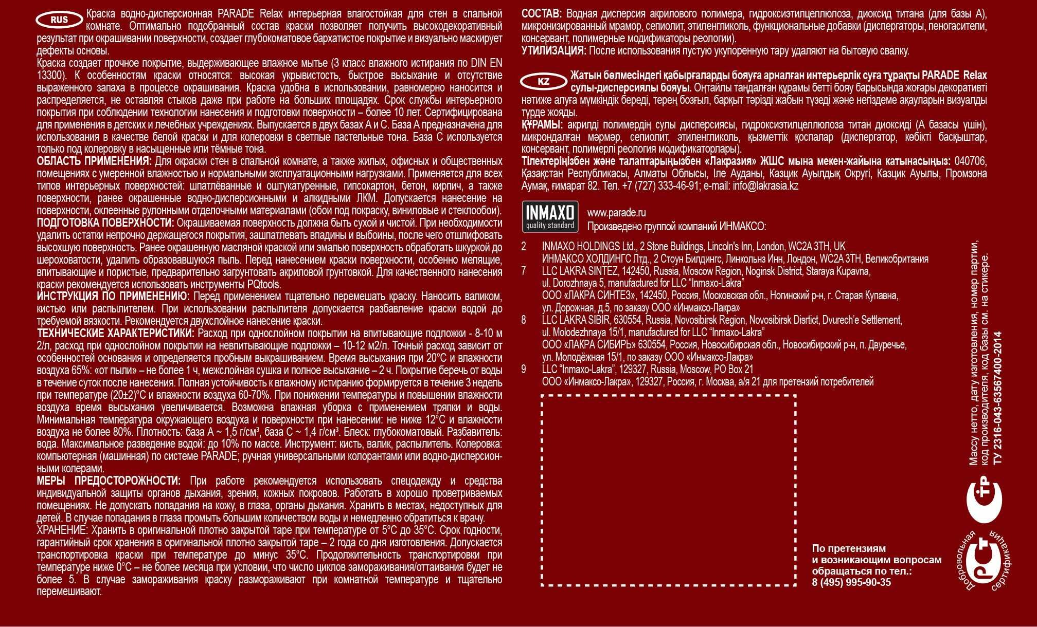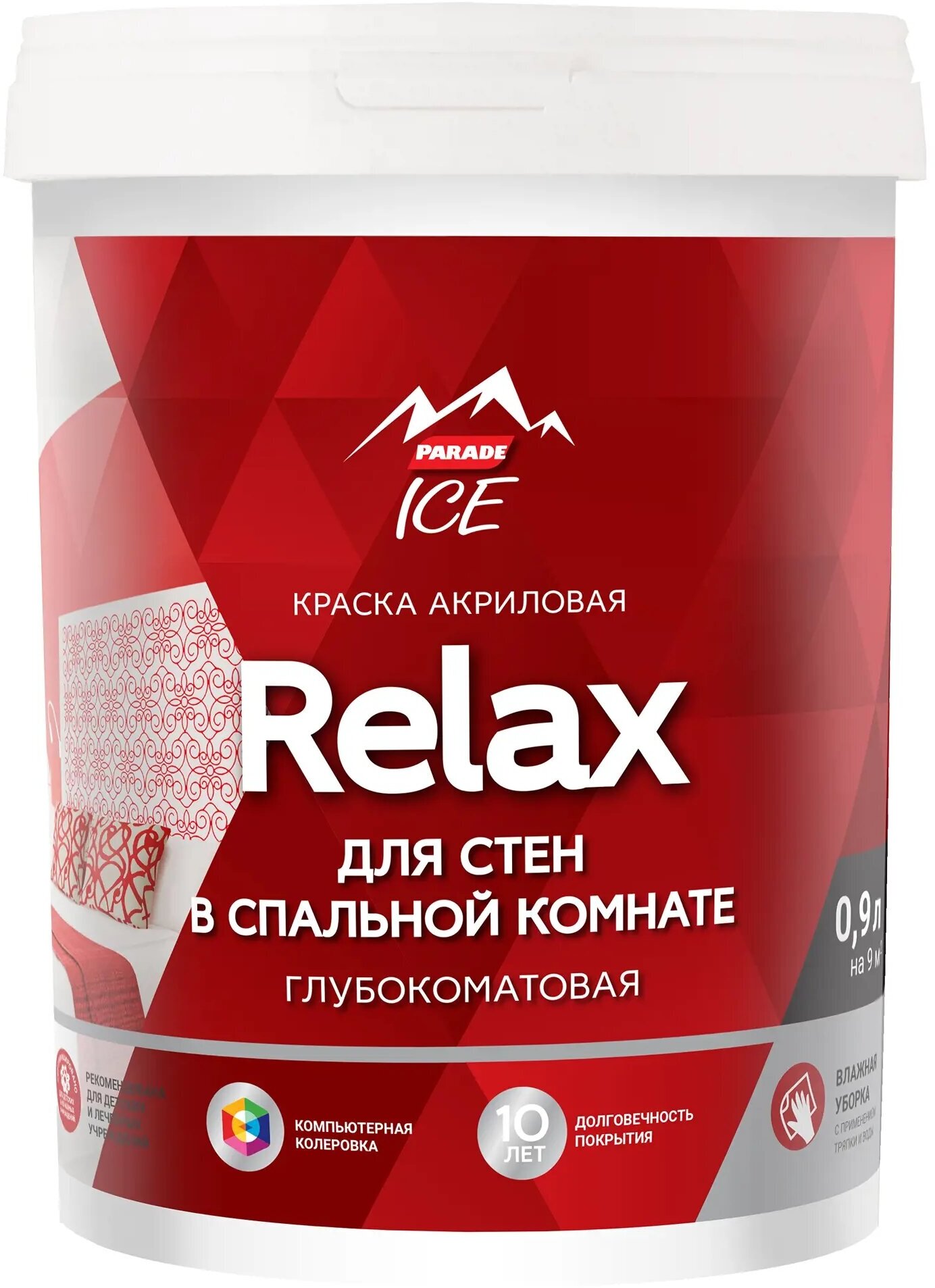 Краска Parade DIY 2 Relax — акриловый состав на водной основе для внутреннего использования. Предназначена для окрашивания жилых помещений. Не имеет запаха, колеруется с универсальными красителями. После окрашивания поверхность приобретает матовый эффект.