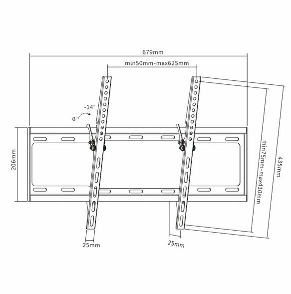 Кронштейн ULTRAMOUNTS с возможностью наклона до 14° предназначен для настенного крепления телевизоров с диагональю от 37 до 70 дюймов. Его надежная стальная конструкция способна выдерживать нагрузку до 35 кг. Одно из главных преимуществ данной модели - минимально возможное расстояние от стены, составляет 25 мм. Благодаря наличию необходимых крепежей в комплекте установка не займет у вас много времени.