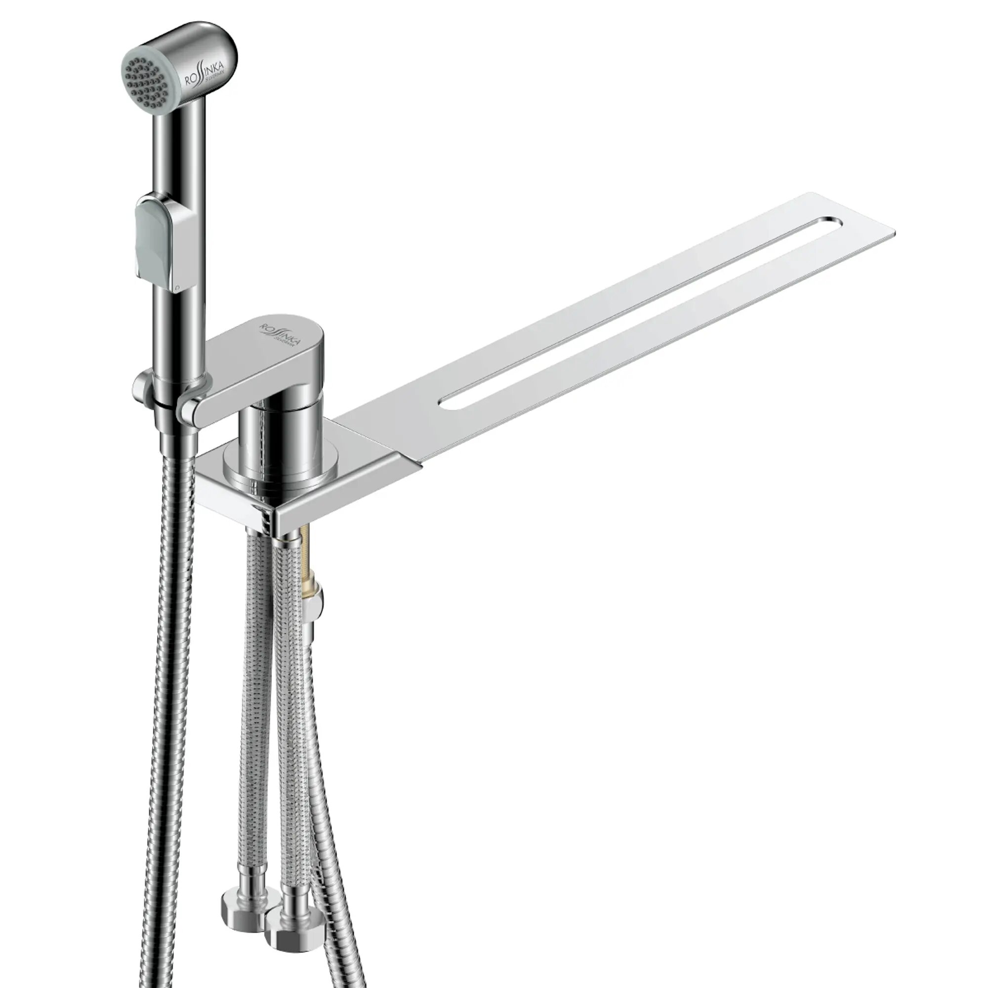 Смеситель для биде Rossinka Silvermix X25-56 — готовый комплект из гигиенического душа с нажимным регулятором и шлангом длиной 90 см, держателя для душевой лейки с уплотнителем для неподвижной фиксации, монтажной планки и двух гибких подводок длиной по 50 см.