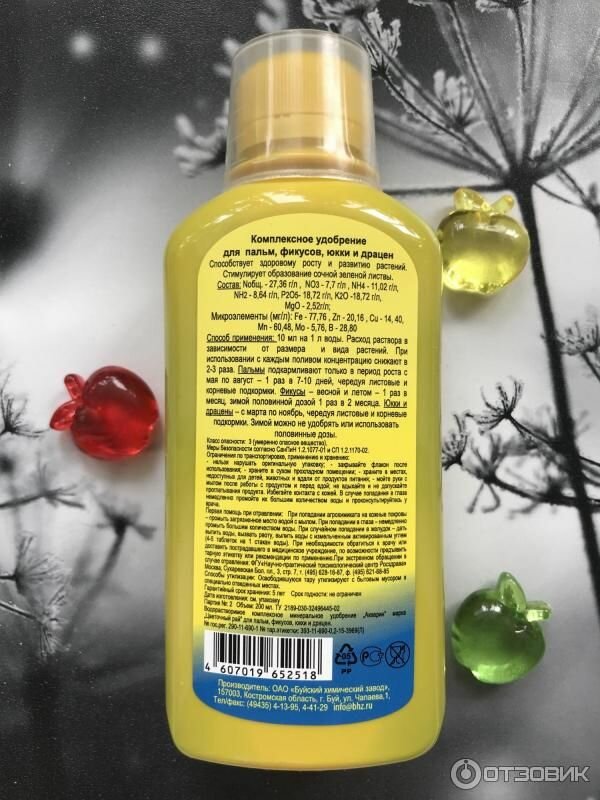 | Состав | азот, фосфор (P2O5), калий (K2O), магний, железо, цинк, медь, марганец, молибден, бор |