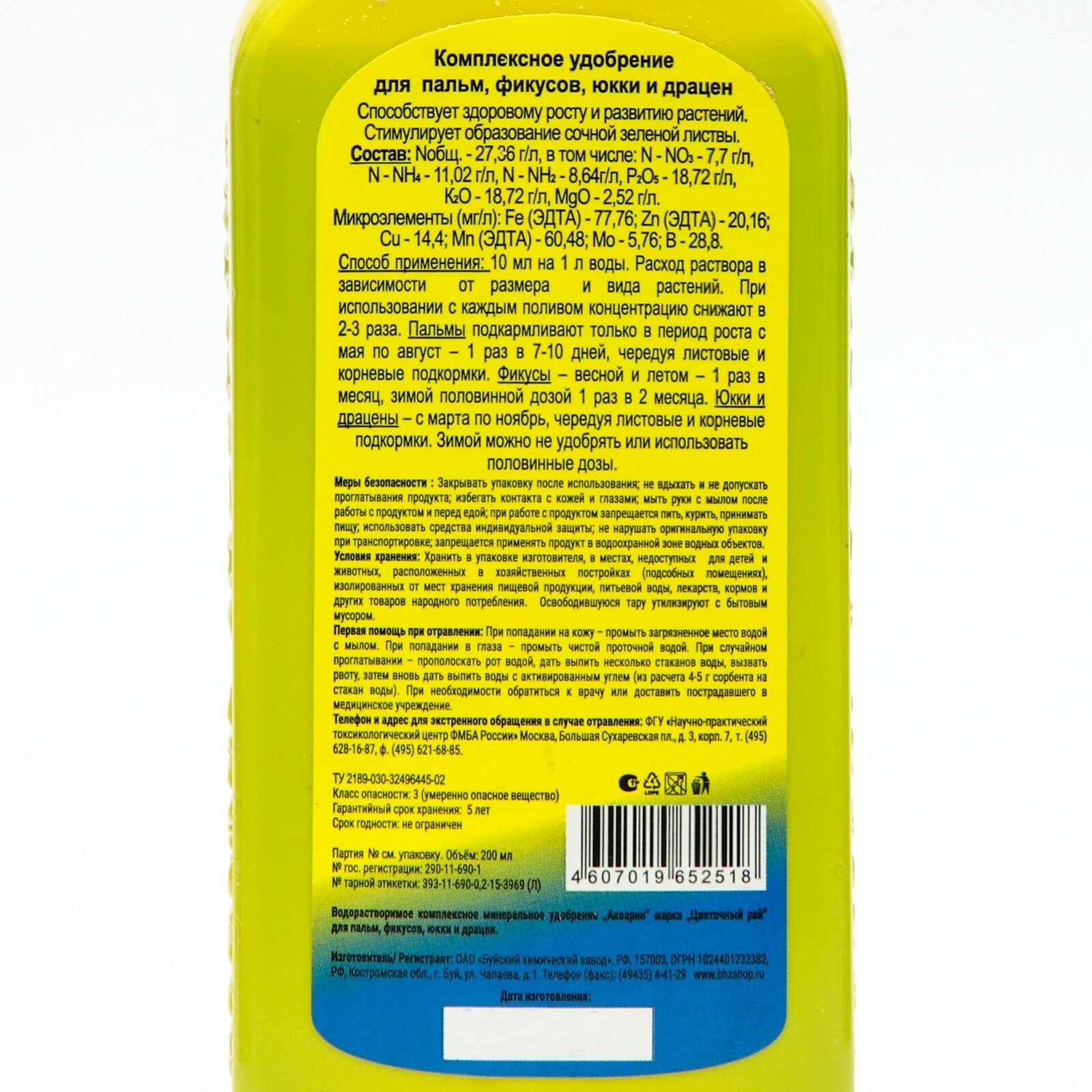 Комплексное, жидкое удобрение. Создает быстрый, видимый эффект. Увеличивает сопротивляемость растений неблагоприятным условиям среды, болезням - удобрение для питания пальм, фикусов, юкки и драцен.