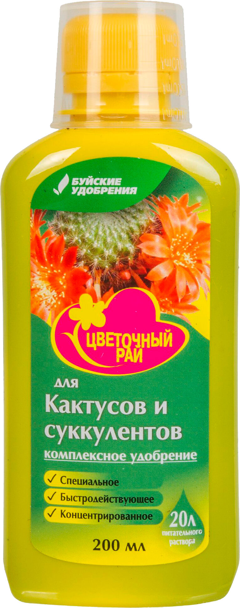 Удобрение «Цветочный рай» является комплексным средством, предназначенным для подкормки кактусов и суккулентов. Насыщено всеми необходимыми веществами, повышающими стойкость растений к воздействию окружающей среды. Концентрированная жидкость содержит азот, калий, магний, фосфор и микроэлементы. Срок годности удобрения не огрнаничен. На крышке флакона закреплен мерный стаканчик, который позволит удобно проводить дозировку. Средство используется для корневой и листовой подкормки.