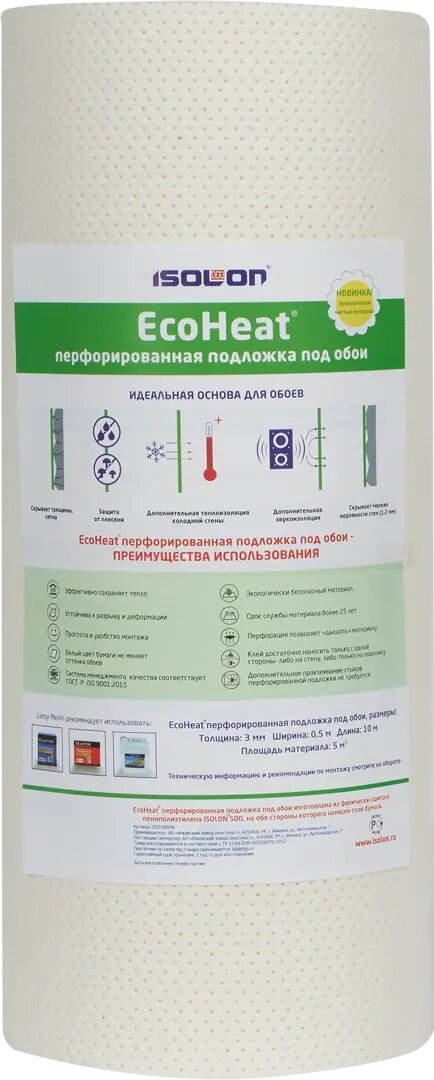 | Применение продукта | Перфорированная подложка под обои EcoHeat предназначена для дополнительной теплоизоляции помещений изнутри. Перфорация позволяет «дышать» материалу, в отличие от других подложек. |