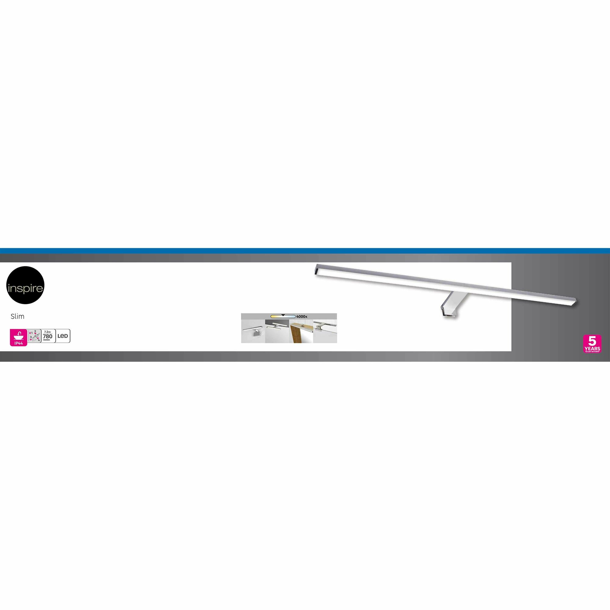 Подсветка для зеркала Inspire Slim выполнена в стиле «Нео-классика». Эффективно освещает пространство перед зеркалом, над туалетным столиком. Корпус обеспечивает защиту от капель и брызг, падающих под любым углом (IP44), поэтому возможна установка во влажных помещениях — ванных комнатах, санузлах.