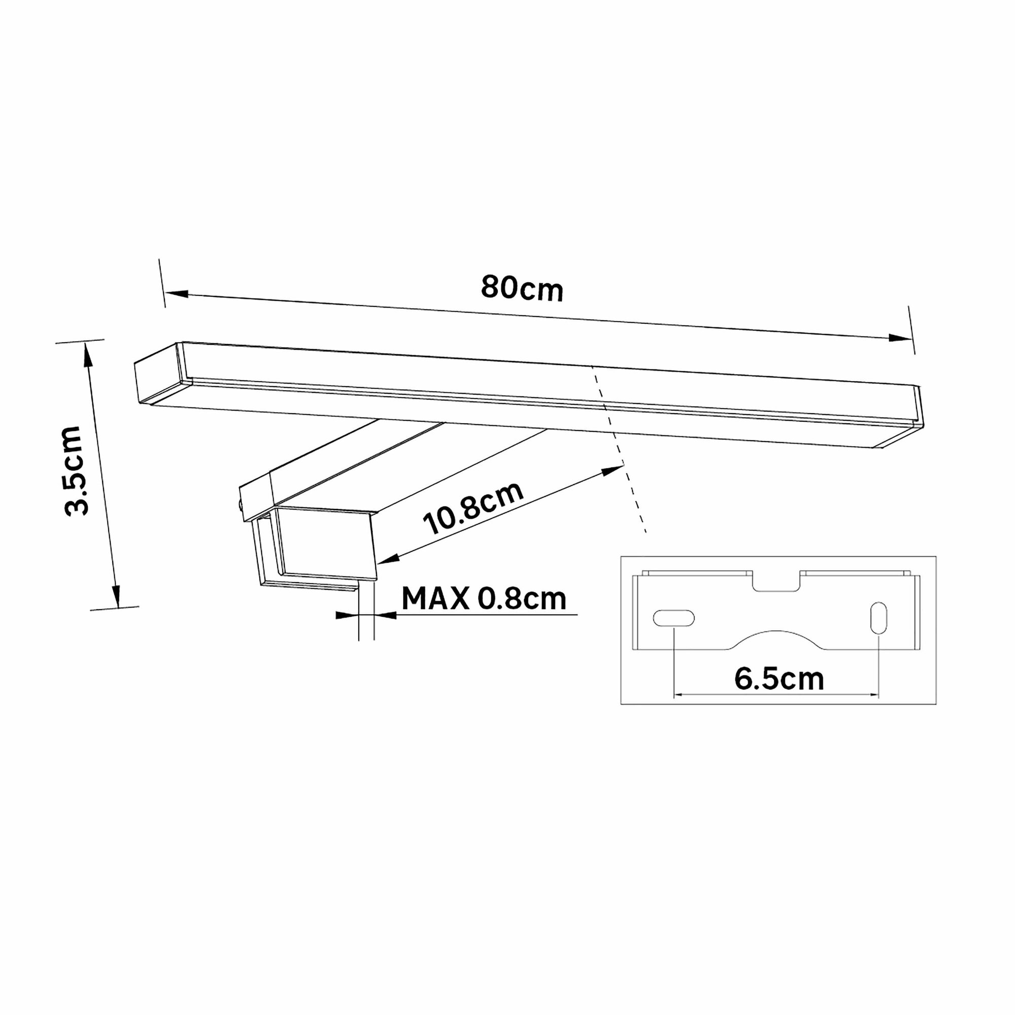 Источником белого нейтрального света служат светодиоды, установленные в плафоне. Стильный тонкий корпус выполнен из пластика и алюминия. Размеры — 12,5 × 3,4 × 80 см.