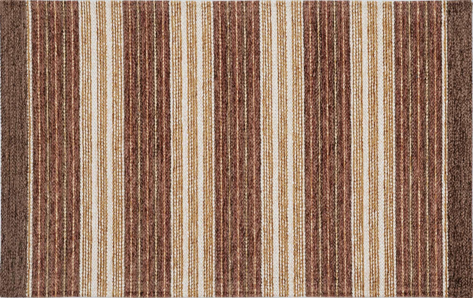 Размер коврика 55 × 85 см, толщина — 5 мм. Коврик не мешает открыванию двери, а благодаря латексной основе плотно прилегает к полу, не скользит и не цепляется за ноги. Изделие изготовлено механическим способом. Состав ворса — 96% акриловый шенилл, 4% вискоза. Основной цвет — коричневый, полосатый узор оживляет интерьер.