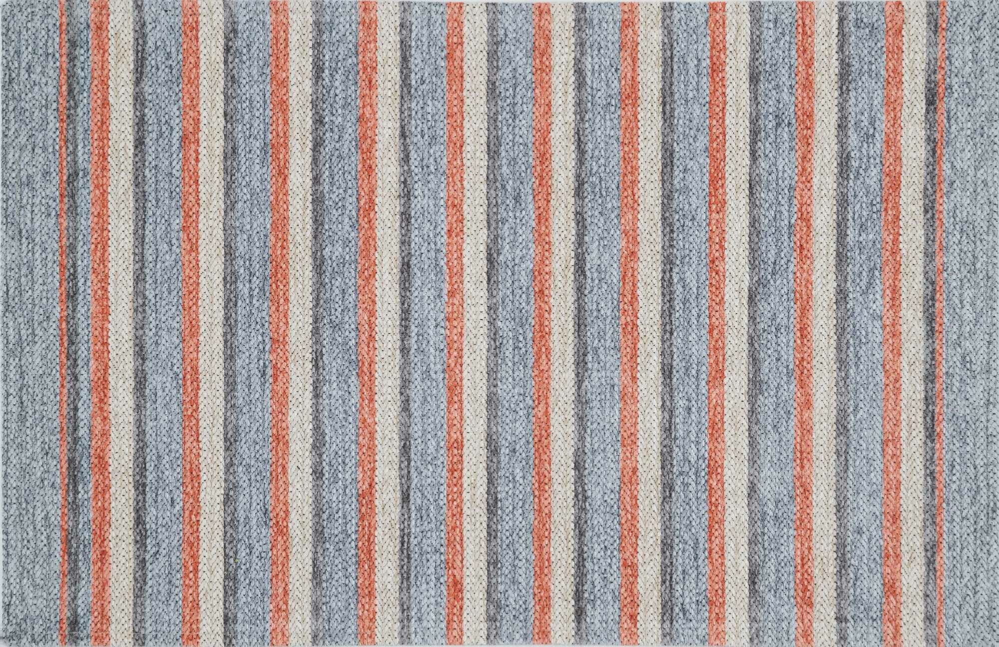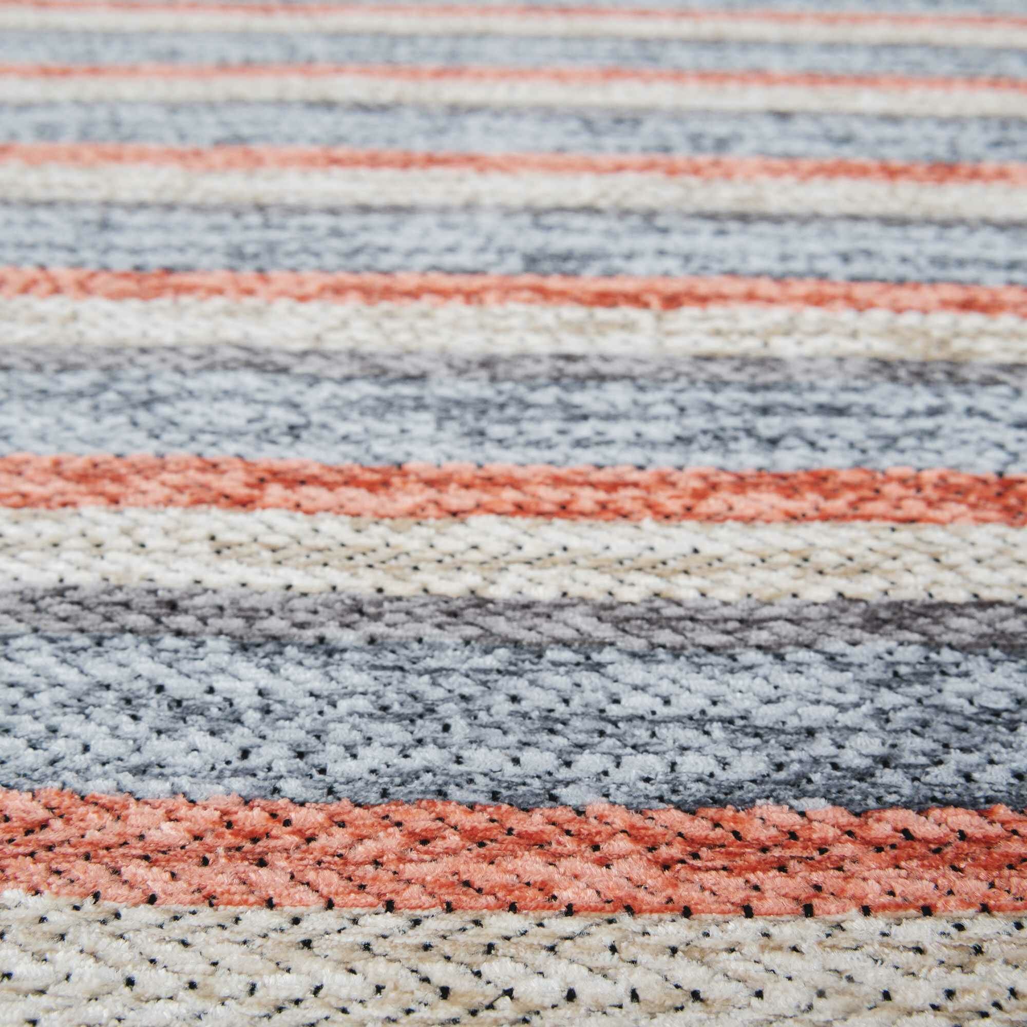 Размер коврика 55 × 85 см, толщина — 5 мм. Коврик не мешает открыванию двери, а благодаря латексной основе плотно прилегает к полу, не скользит и не цепляется за ноги. Изделие изготовлено механическим способом. Состав ворса — 96% акриловый шенилл, 4% вискоза. Основные цвета — серый и розовый, полосатый узор оживляет интерьер.