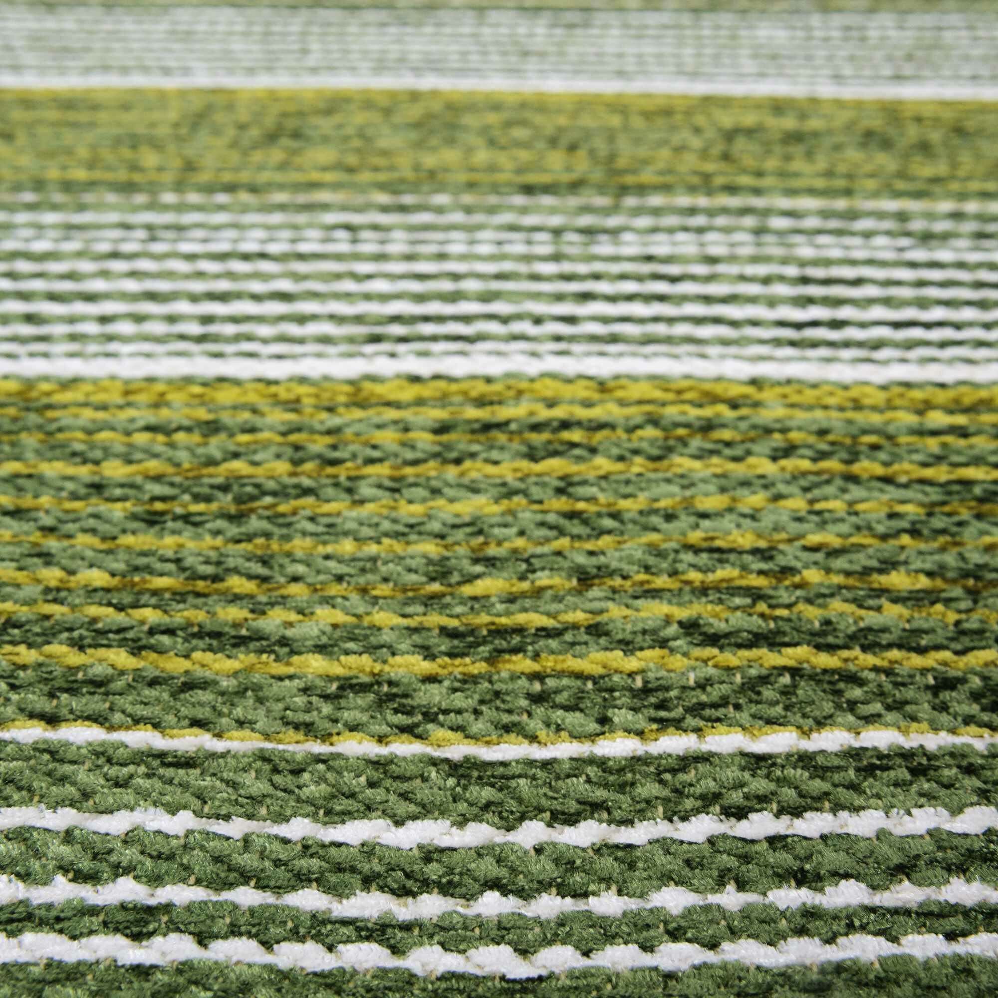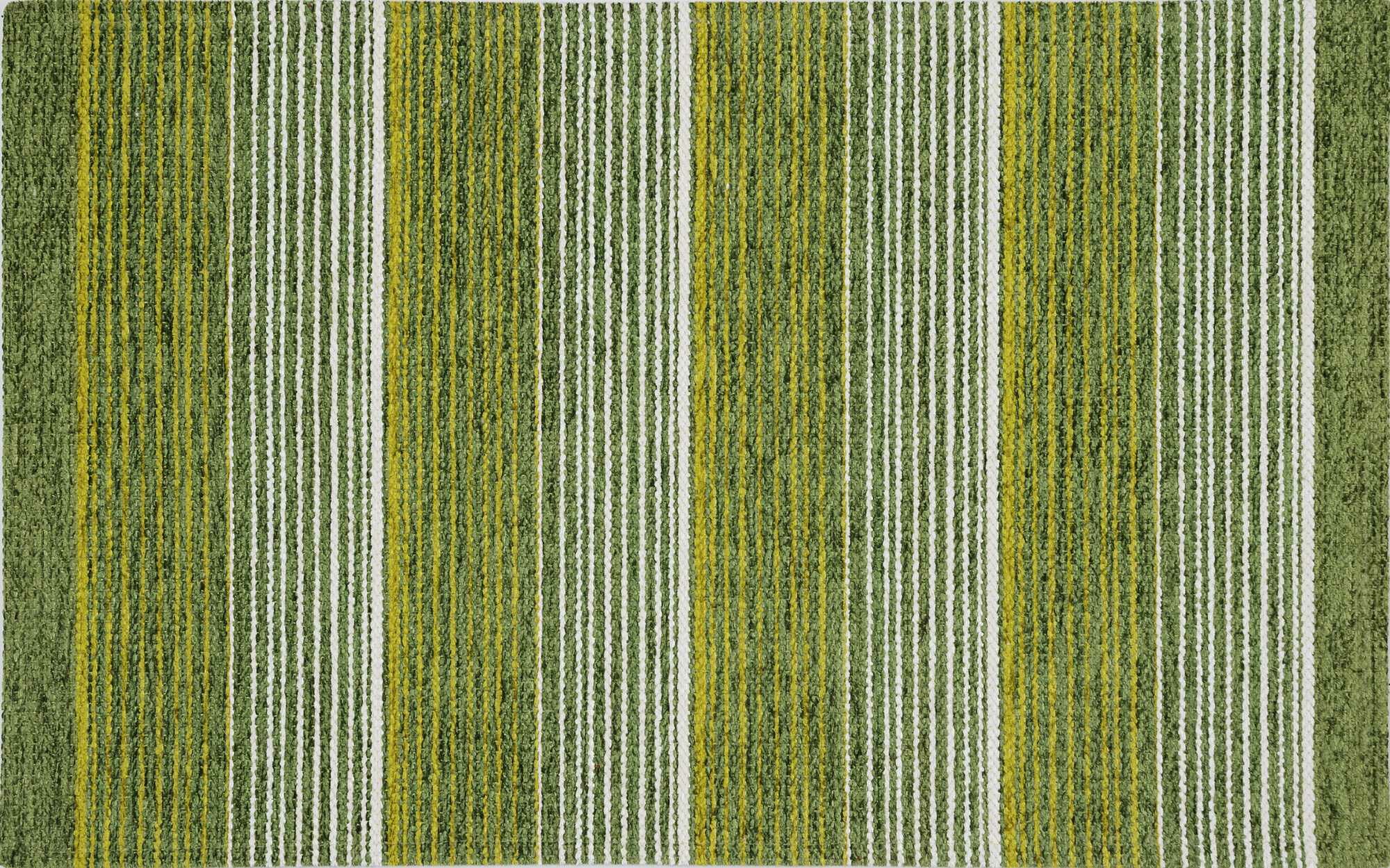 Размер коврика 55 × 85 см, толщина — 5 мм. Коврик не мешает открыванию двери, а благодаря латексной основе плотно прилегает к полу, не скользит и не цепляется за ноги. Изделие изготовлено механическим способом. Состав ворса — 96% акриловый шенилл, 4% вискоза. Основной цвет — зелёный, полосатый узор оживляет интерьер.