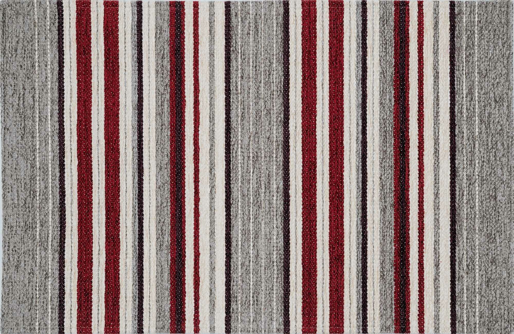 Размер коврика 55 × 85 см, толщина — 5 мм. Коврик не мешает открыванию двери, а благодаря латексной основе плотно прилегает к полу, не скользит и не цепляется за ноги. Изделие изготовлено механическим способом. Состав ворса — 96% акриловый шенилл, 4% вискоза. Основные цвета — серый и красный, полосатый узор оживляет интерьер.