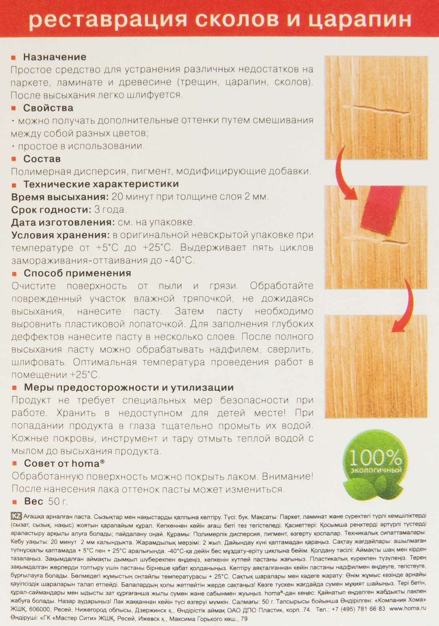 Качественная паста цвета «бук» используется для восстановления паркета, ламината и других деревянных изделий. Для удобного использования комплектуется небольшим шпателем. Высыхает за 12 часов, обеспечивая поврежденным участкам прочное водонепроницаемое покрытие.