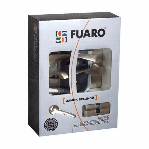 Врезной замок Fuaro SET F9011 в комплекте с ручками — надежный запорный механизм. Оснащен ручками нажимного типа и цилиндровым замком из латуни. Имеет универсальную в использовании защелку, которая подходит как для левых, так и для правых полотен. Механизм устанавливается на входных и межкомнатных деревянных дверях. Укомплектован стяжными винтами, крепежом и стальной ответной пластиной для крепления на коробку. В наборе 5 ключей.