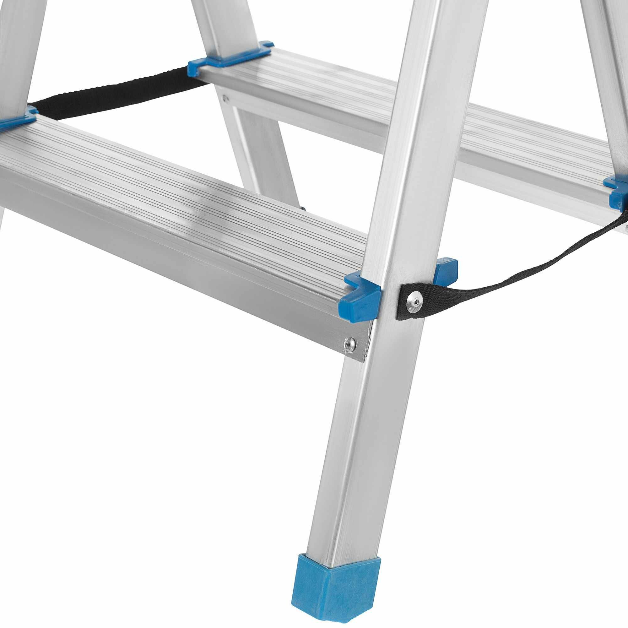 Двухсторонняя стремянка из алюминия на 2 ступени очень удобна как для выполнения различных садовых работ, так и при ремонте. Прочные поперечные ремни придают конструкции дополнительную устойчивость, не позволяя ножкам разъезжаться даже при высокой нагрузке.