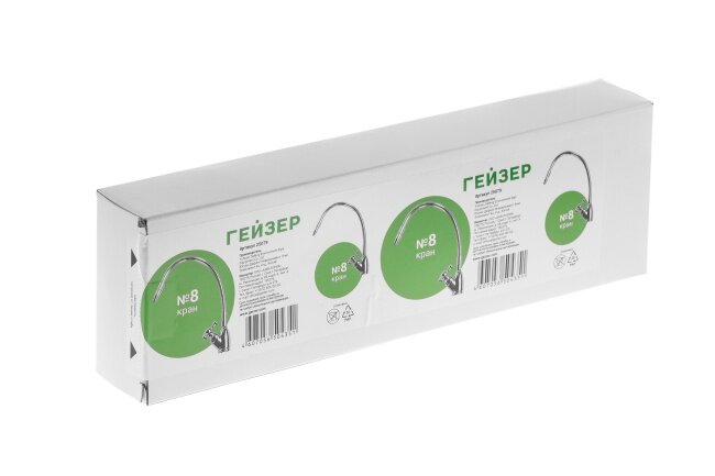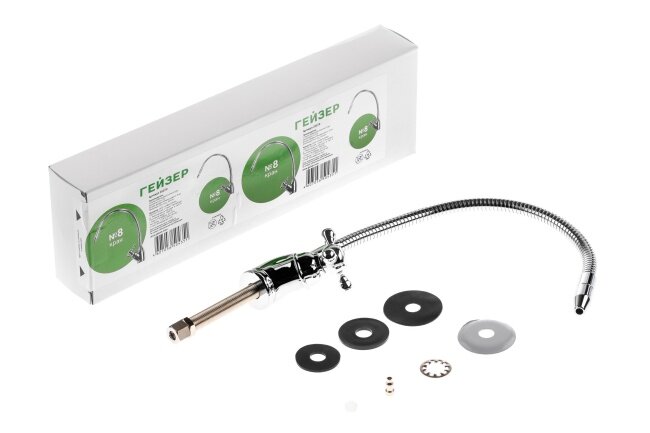 Кран чистой воды «Гейзер» № 8 имеет гибкий излив в металлической оплетке, который позволяет менять угол наклона струи. Изделие предназначено для регулирования подачи холодной воды, очищенной с помощью фильтра питьевого водоснабжения. Кран имеет хромированное покрытие, которое предотвращает коррозионные процессы. Изделие относится к типу ремонтопригодных, при этом картридж запорного клапана может извлекаться. Кран устанавливается на мойку или столешницу с помощью шайб и цанговой гайки.