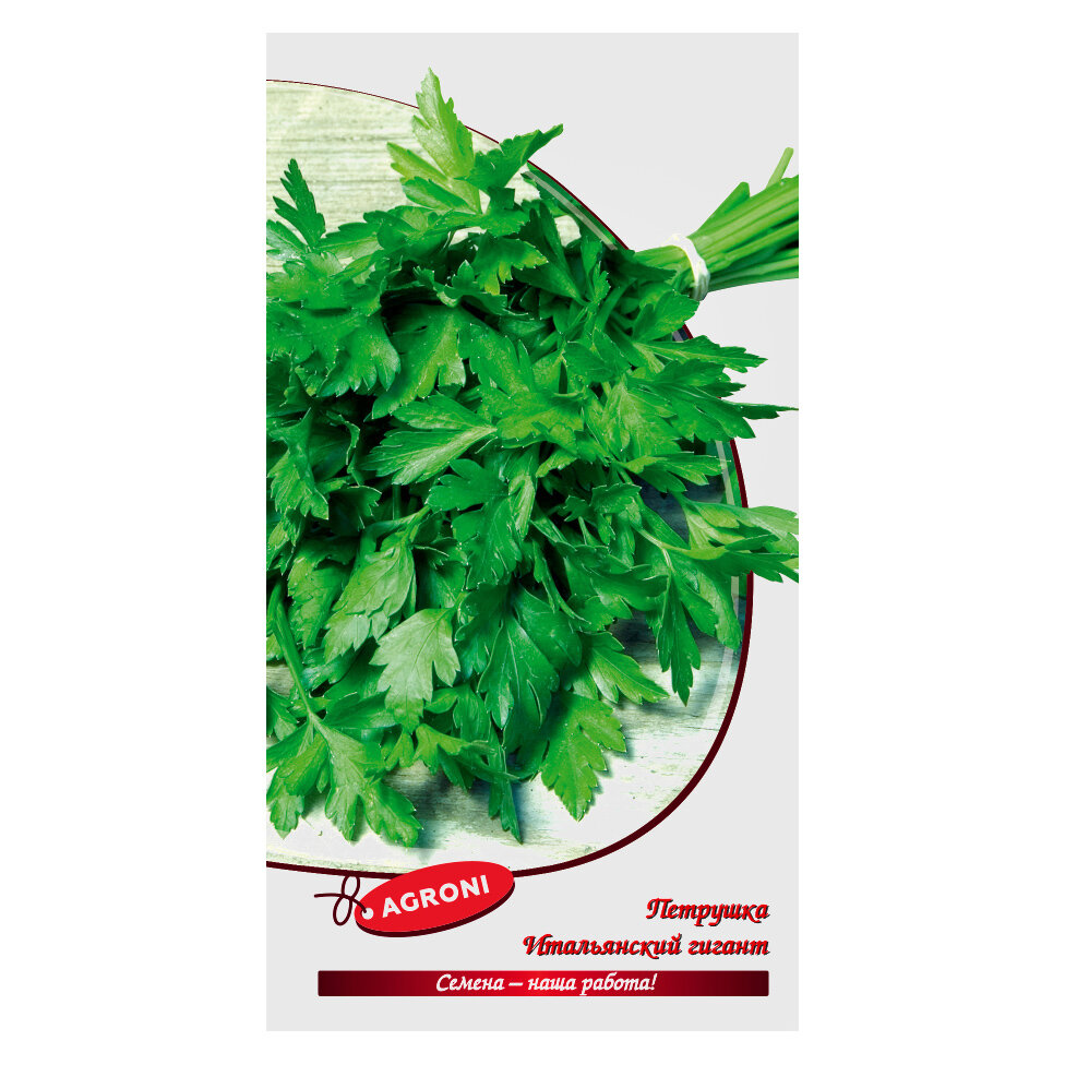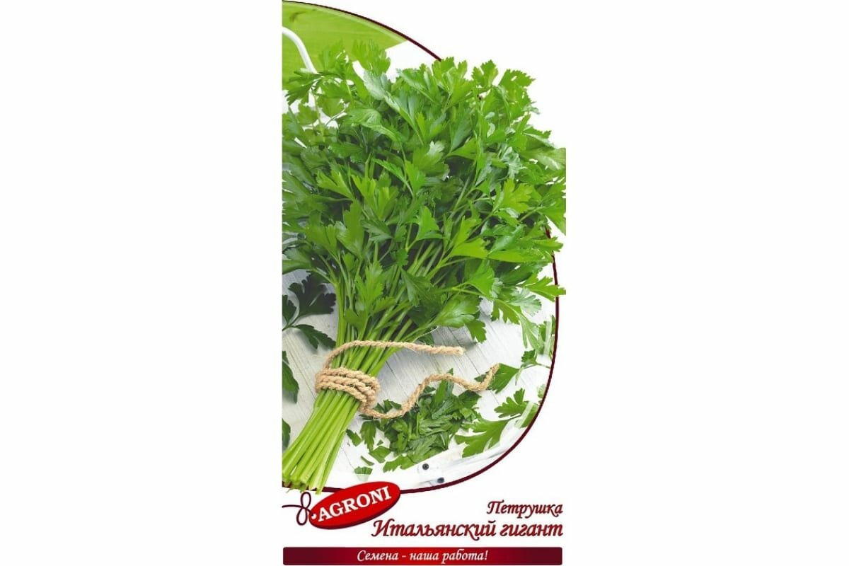 Петрушка «Итальянский гигант» — ароматный, среднеспелый сорт, подходит для выращивания в горшечной культуре. Растение среднерослое, высотой до 60 см, с собранными в плотную розетку листьями. Зелень нежная, отличного вкуса и аромата, хорошо отрастает после срезки. В сушеном виде сохраняет вкусоароматические качества, используется в качестве приправы.