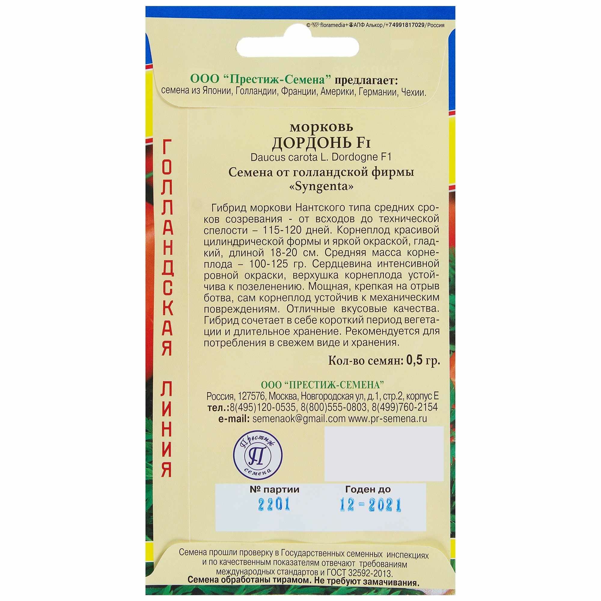 Морковь «Дордонь» F1 — гибрид нантского типа, созревающий за четыре месяца. Оранжевые гладкие корнеплоды имеют правильную цилиндрическую форму. Они могут храниться достаточно долго даже без дополнительной обработки. Отличные вкусовые свойства позволяют употреблять морковь в сыром виде, добавлять в салаты и другие блюда, делать из нее сок.