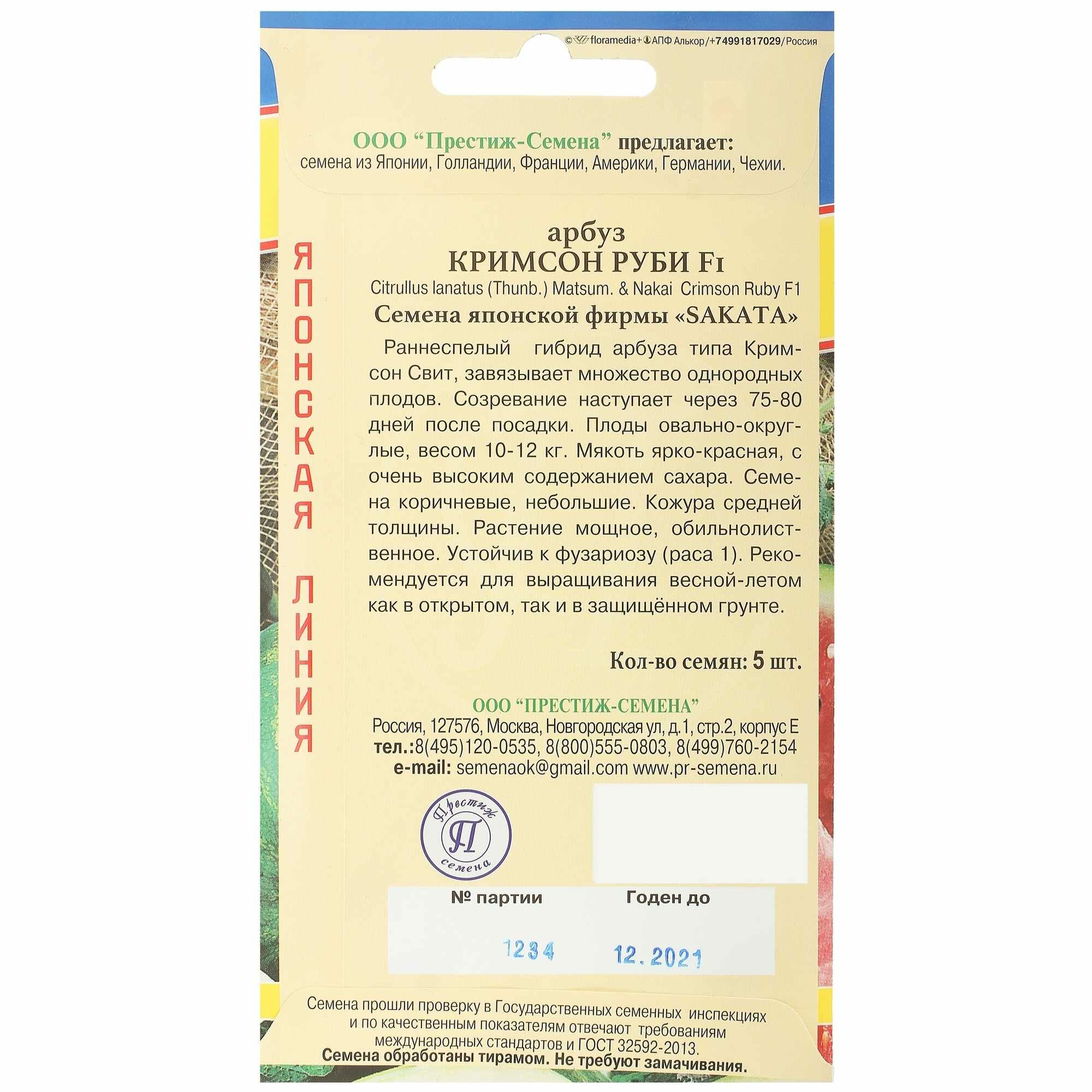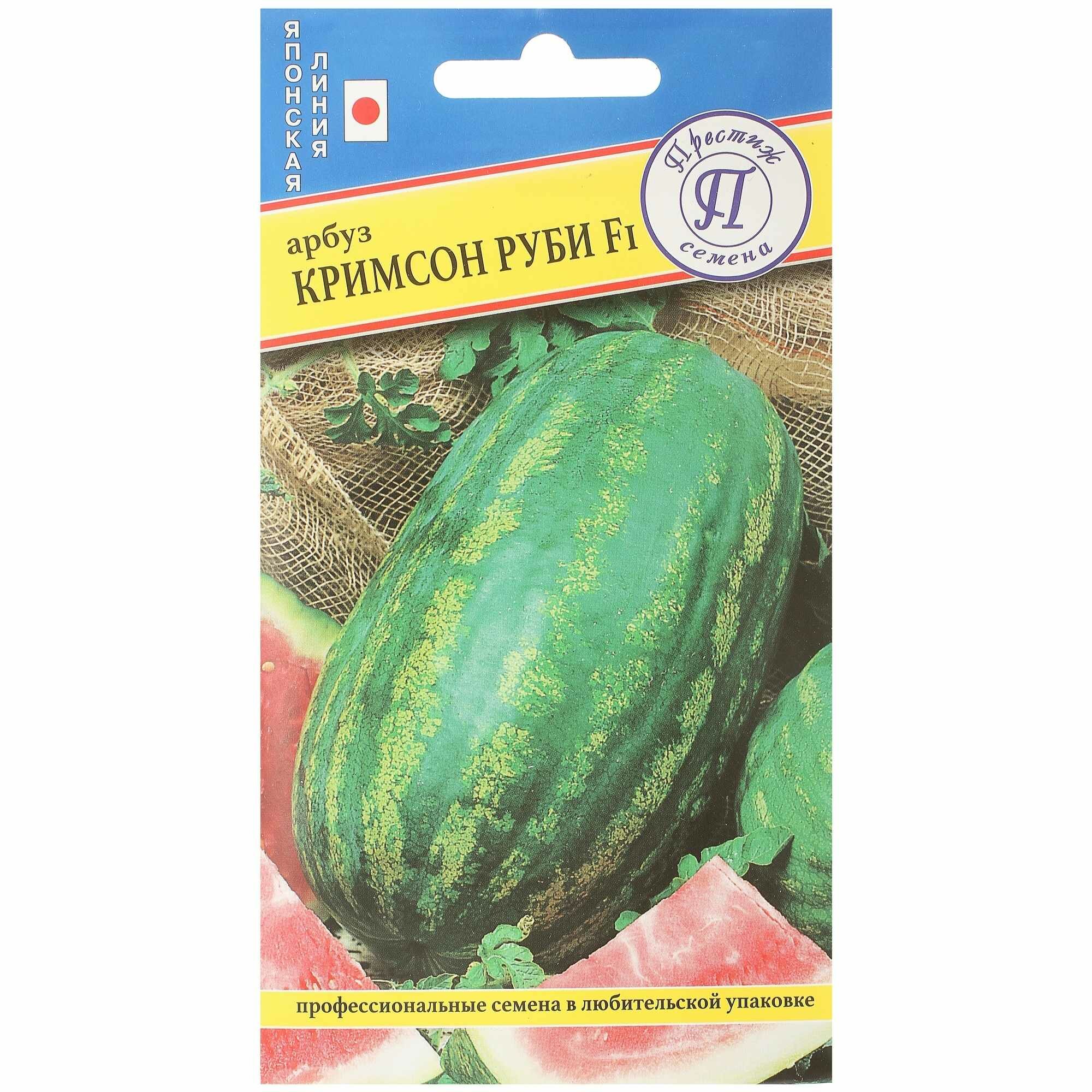 Арбуз «Кримсон Руби» F1 — раннеспелый гибрид, дающий обильный урожай. Плоды округлые, овальной формы с ярко-красной и очень сладкой мякотью. Косточки небольшие, коричневые, кожура средней толщины. Период от посадки до созревания составляет 75–80 дней. Растение устойчиво к фузариозу и другим опасным заболеваниям.