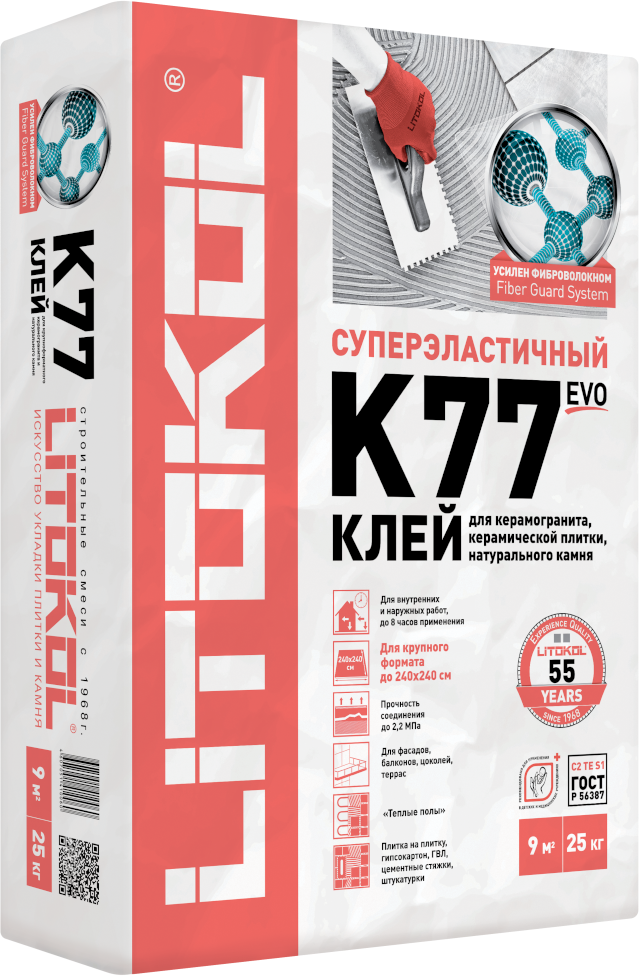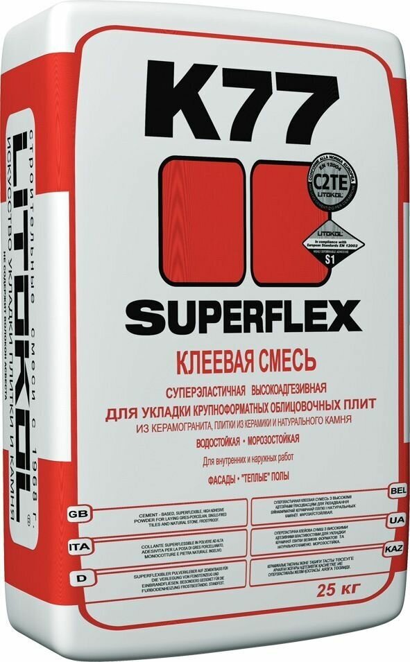 Клей Superflex K77 — монтажный состав в виде порошка, разводится непосредственно перед применением. Разработан специально для керамической плитки и керамогранита. Смесь применяется для наружных и внутренних работ. Рекомендуется к нанесению на минеральные основания (каменные, кирпичные, бетонные и газобетонные, отштукатуренные поверхности). Правильно подобранный качественный клей упростит процесс укладки плитки и обеспечит долгий срок службы покрытия.