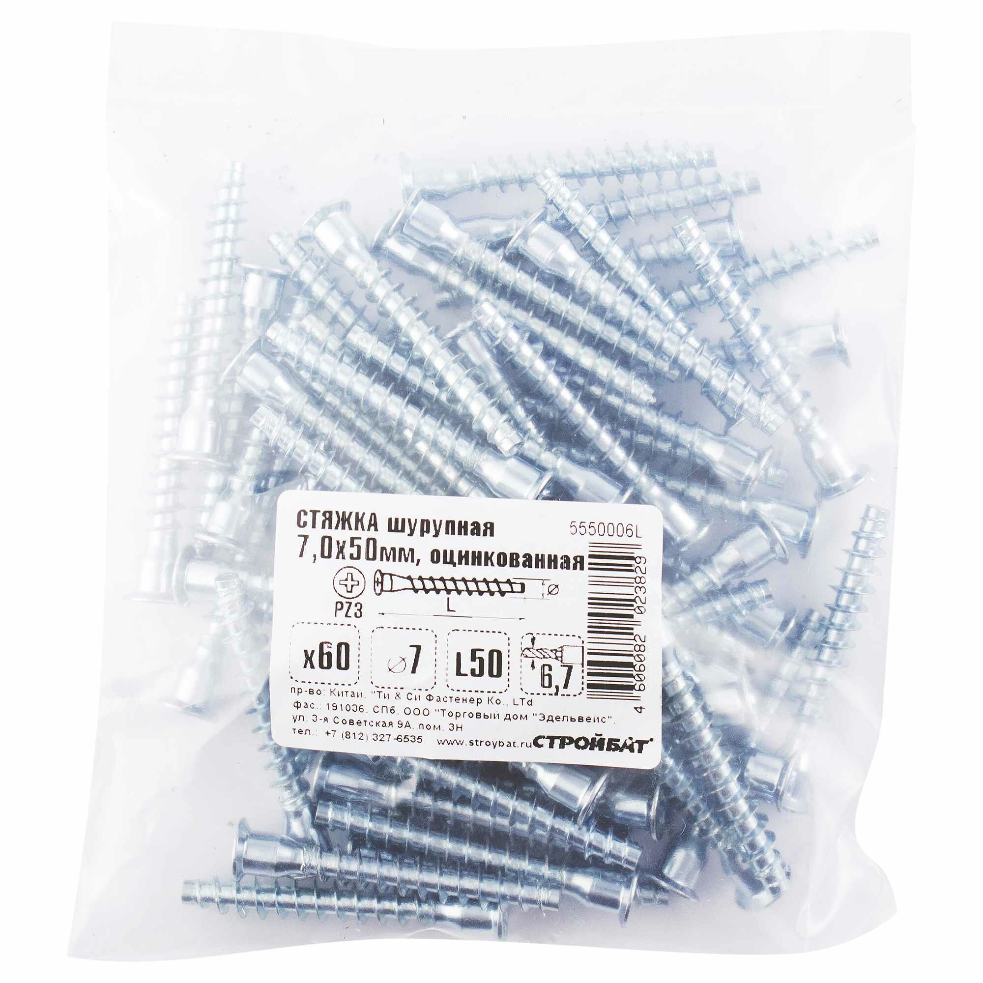 Стяжка шурупная — один из соединительных элементов, используемых в мебельном производстве. Изготовлена из металла и предназначена для соединения листов ДСП под прямым углом. Применяется после предварительной подготовки отверстия. У такого шурупа плоская головка, которая практически полностью входит в лист. Место крепления можно закрыть специальной декоративной заглушкой из пластмассы в цвет основного фона. В предлагаемой упаковке 60 таких крепежей. Преимущества: - геометрия резьбы обеспечивает плотность вхождения; - надежность соединения; - оптимальное соотношение цены и качества.