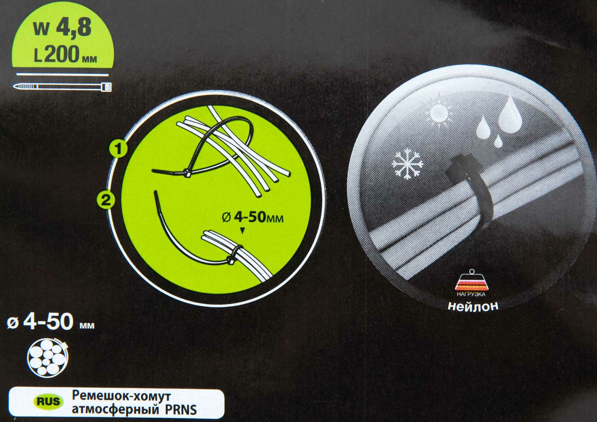 Черные атмосфероустойчивые хомуты шириной 4,8 мм используются для упаковки любых проводов в изоляции в аккуратные пучки при монтаже или разводке. Хомуты длиной 200 мм хорошо противостоят агрессивному воздействию атмосферных факторов и надолго сохраняют свои характеристики при монтаже на открытых площадках.