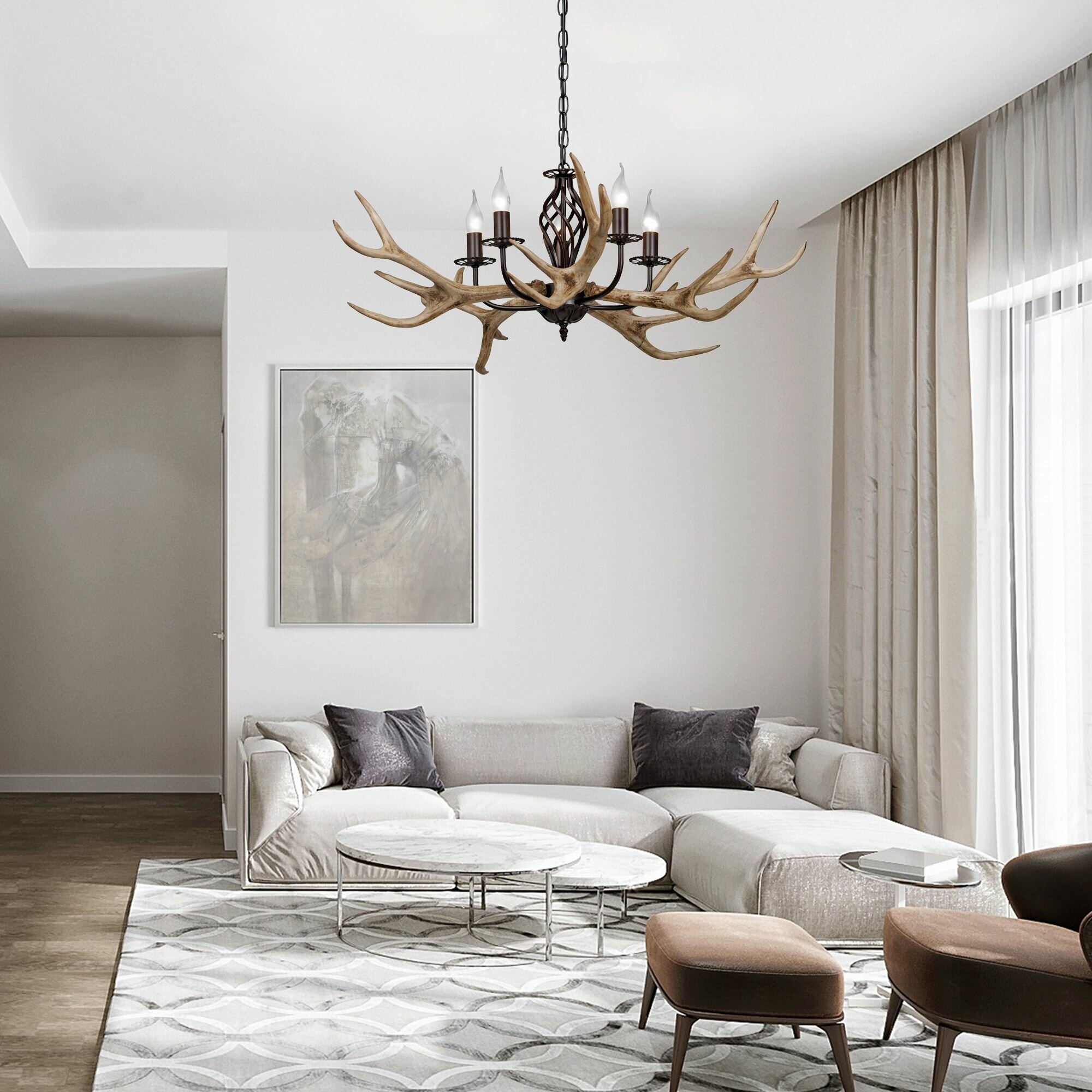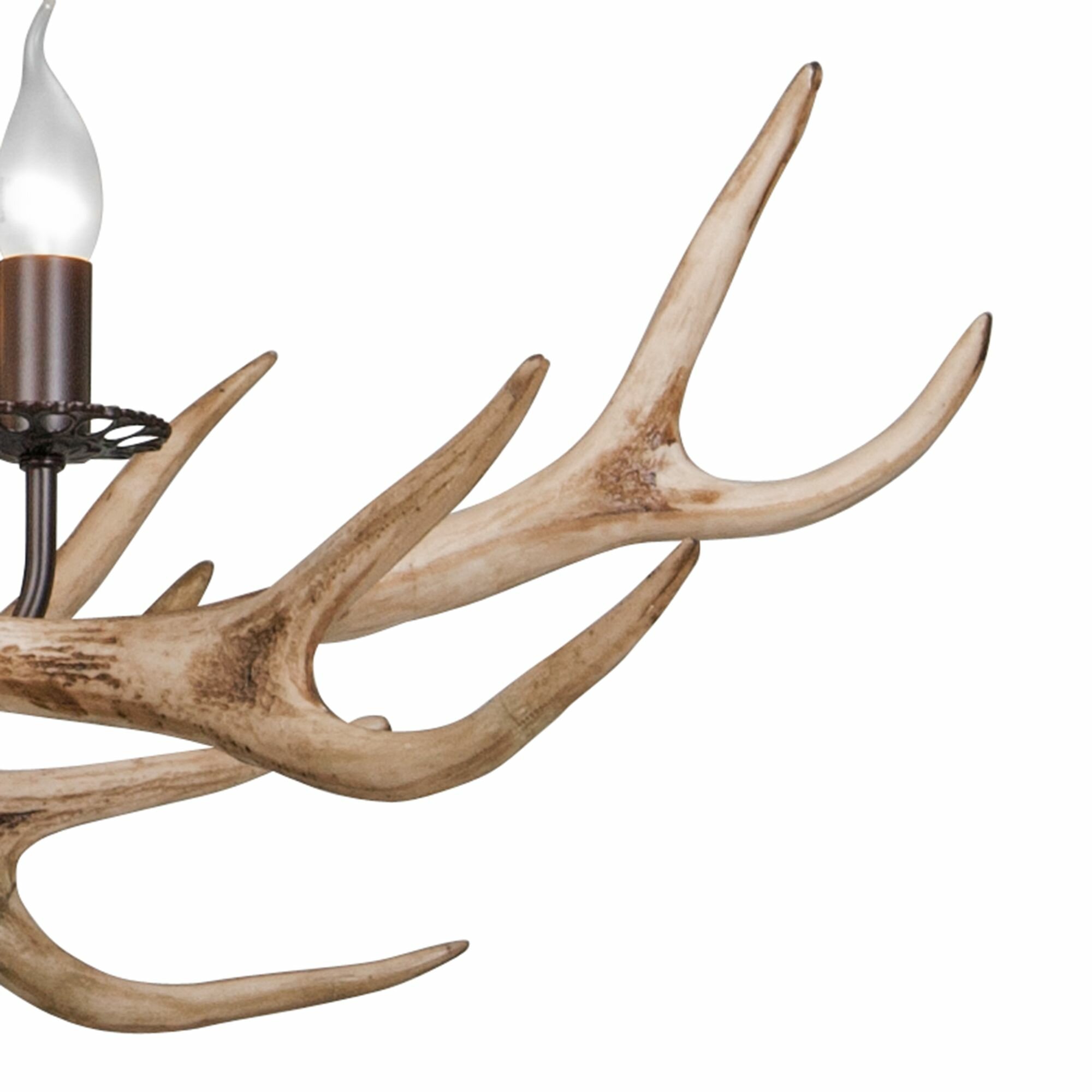 Рожки светильника смотрят вверх. Для оптимального размещения в интерьере комнаты можно отрегулировать высоту светильника от 60 до 110 см, чтобы адаптировать его под высоту потолка. При снижении конструкции световой поток акцентируется в определенной зоне, при поднятии — мягко рассеивается. Для работы необходимы 5 ламп с мощностью 60 Вт. Материалом основания служит металл. Тип цоколя лампы: E14.