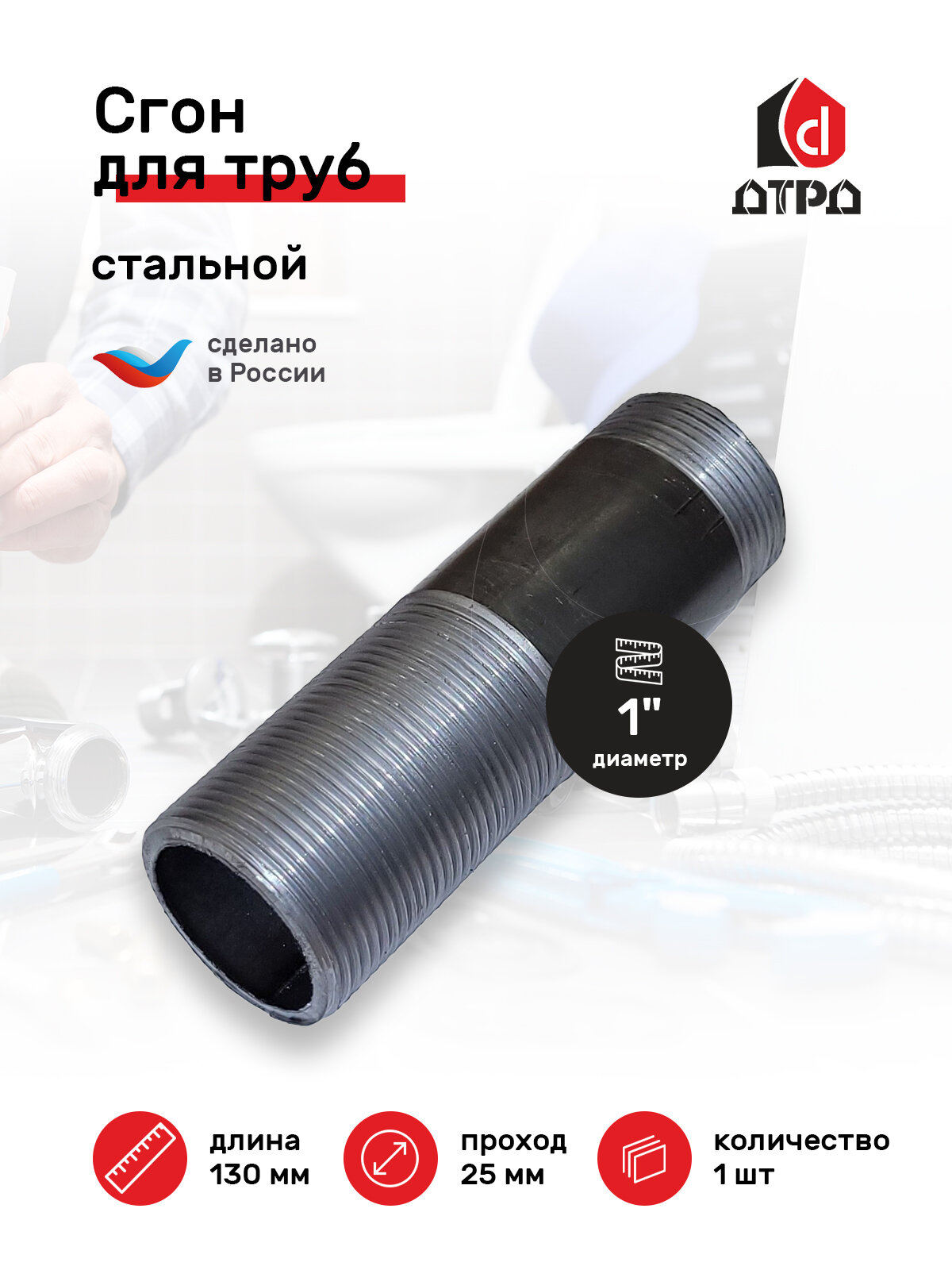Сгон используется при монтаже трубопровода и подключении к нему бытовых приборов или запорной арматуры. Деталь представляет собой отрезок стальной трубы диаметром 1"дюйм и длиной 130 мм, снабженный наружной резьбой на обоих концах. Толщина стенок сгона в 2 мм позволяет выдерживать ему значительное давление. Производится в России.