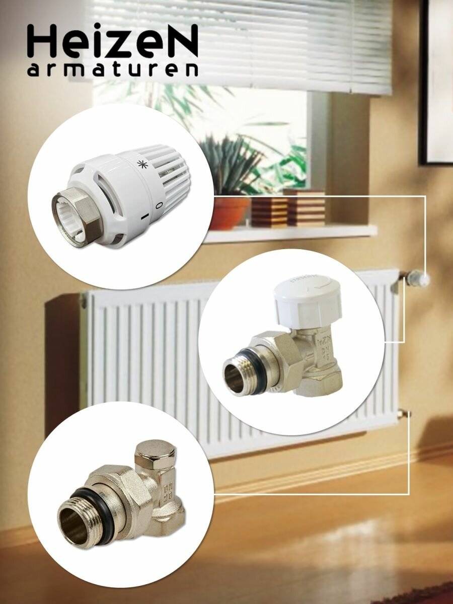 Термостатический комплект для углового подключения радиатора Heizen поможет обеспечить тепло и комфорт, защитит от замерзания и уменьшит траты на отопление. Устройство предназначено для автоматической регулировки температуры. Комплект уже содержит все необходимое для подключения и легко устанавливается на радиатор. Для того, чтобы задать желаемую температуру, достаточно просто повернуть рукоять. При необходимости можно добавить режим ограничения настроек для предотвращения несанкционированного доступа к регулятору.