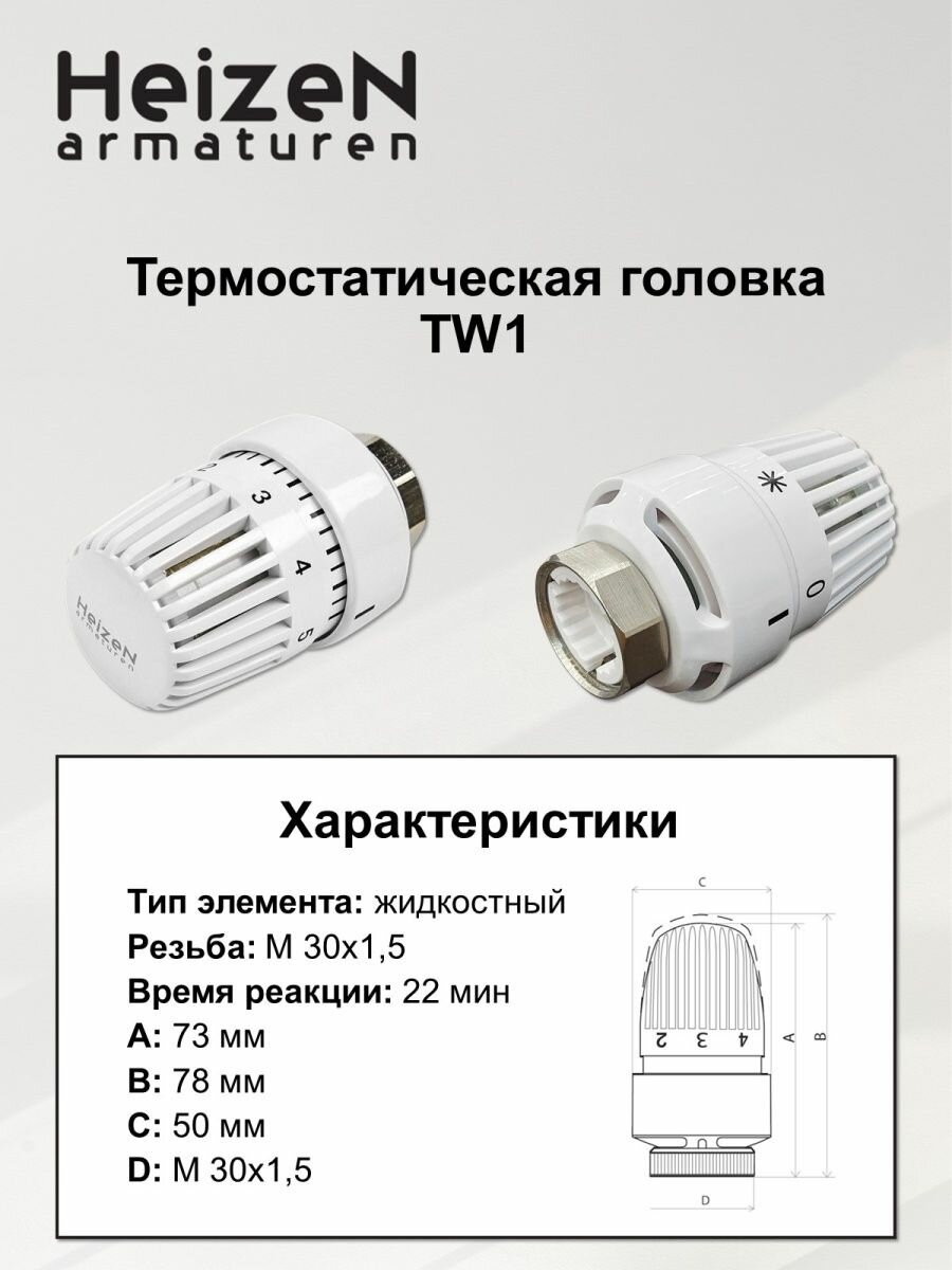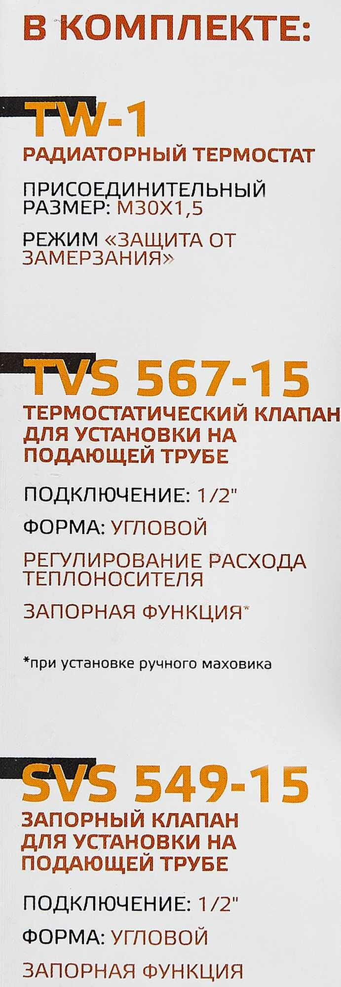 | Состав комплекта | термоголовка TW-1; термостатический клапан М30*1,5; запорный клапан |