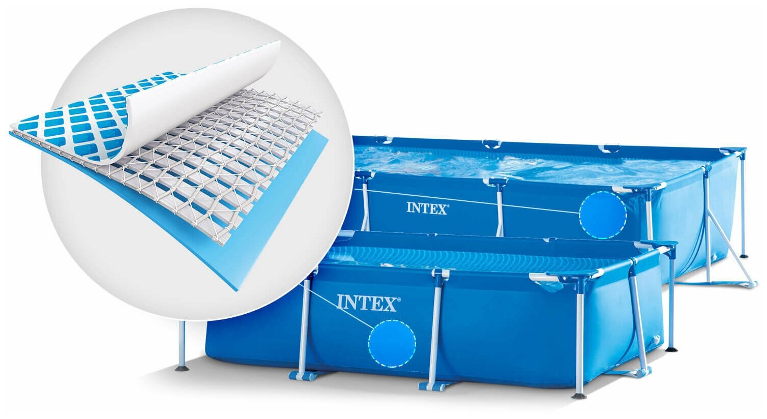 Прямоугольный каркасный бассейн INTEX отличает небольшой вес упаковки и простота сборки. Преимуществом этой модели является лёгкость монтажа и удобство при транспортировке. Установка бассейна не требует специальной подготовки грунта и присутствия специалиста, деинсталляция этого бассейна производится с такой же лёгкостью.