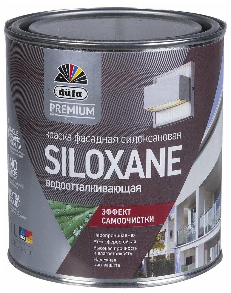 Краска фасадная Dufa Siloxane, которую мы предлагаем купить, предназначена для окрашивания стен из гладких и пористых материалов, исключая дерево. Присутствие в маркировке краски обозначения base 1 означает, что она образует глубокоматовую поверхность и имеет ограничения по интенсивности колеровки. Цена за ведерко краски емкостью 2,5 л не так велика, если учесть экономный расход материала. Одного литра хватает на 14 м2 гладкой или 10 м2 пористой поверхности.