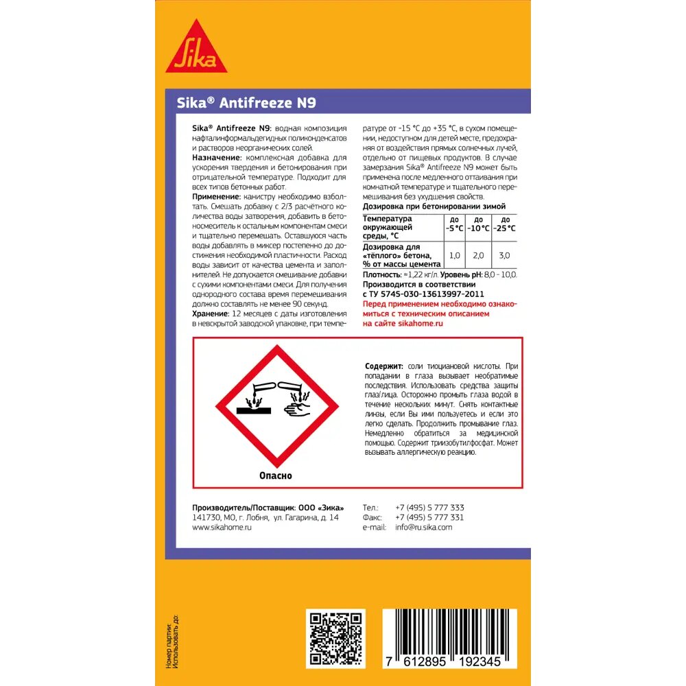 Комплексная добавка Sika Antifreeze N9 предназначена для введения в строительные растворы для наружных работ. Компоненты добавки ускоряют время застывания цемента и сокращают период набора его прочности при температурах до минус 25 градусов.